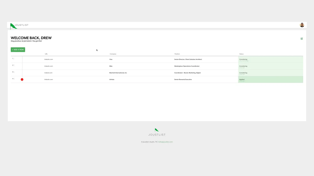 The job search is overwhelming. Use Joustlist (for free) to organize your job prospects across all job sites. Track where you’ve applied, when you interviewed, and if you’ve heard back. Get reminded to follow up. Give yourself the best possible chance to land the best possible job.