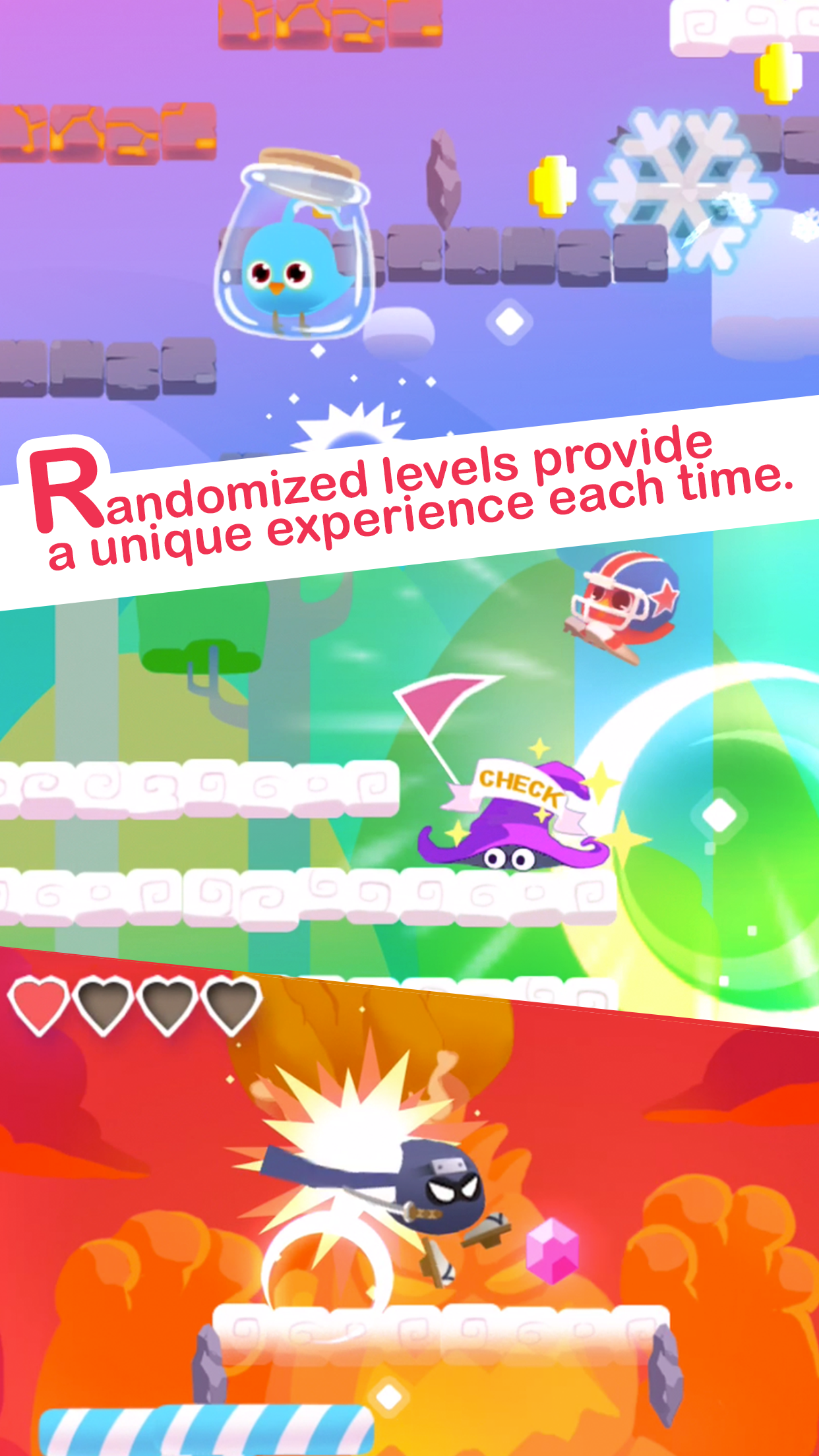 + Every time you enter this game, there will be random levels waiting for you! + 12 bird heroes with different abilities. + 50+ items to be explored in the game. + Hundreds of well-designed level patterns. + Fight against various monsters and the crazy boss! + Rescue buddies, train your skill! + Get achievement and rewards! + One finger tap to enjoy all of this and download for free!
