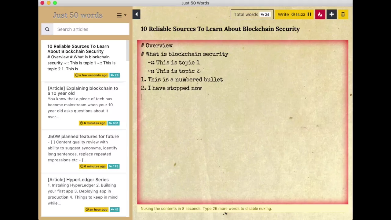Just 50 Words is an open source editor for creating long form contents like articles, blog posts etc. It features distraction free smart editor, writing prompt generator, Write or Nuke, Pomodoro timer, Word count tracker etc and is available for Mac, Windows and Ubuntu Visit https://just50words.com for details and download It features: - A distraction free smart editor that automatically saves as you write and has other nifty features that saves you time - Word count tracker with the ability to set word targets and then get positive feedback on achieving those targets. - A complete Pomodoro system to set writing session intervals so that you can use short focussed intervals to write. - A Write or Nuke feature where if you stop writing before completing the target words, everything that you wrote is cleared. This forces you to complete your first draft faster. - Almost everything can be configured using an easy configuration screen - User interface designed for the rest of us