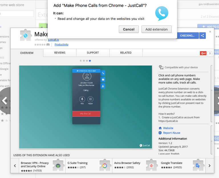 Once you download this extension, all the phone numbers on any web page will convert into click-to-call buttons with JustCall icon beside these buttons. Upon clicking any of these buttons, JustCall dialer will open up. And, you can start making calls right away using your JustCall phone numbers. Currently, this extension picks up only those phone numbers which are present with “tel:” attribute. At any moment of time, if you want to call any number from your Chrome browser – just click the JustCall icon present next to address bar of your browser and it will open up the JustCall dialer. You can add contacts, access your address book and use any of your JustCall phone numbers to make a call. All these calls made via JustCall Dialer immediately get recorded and logged into the JustCall system which you can access anytime.