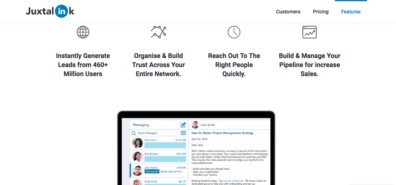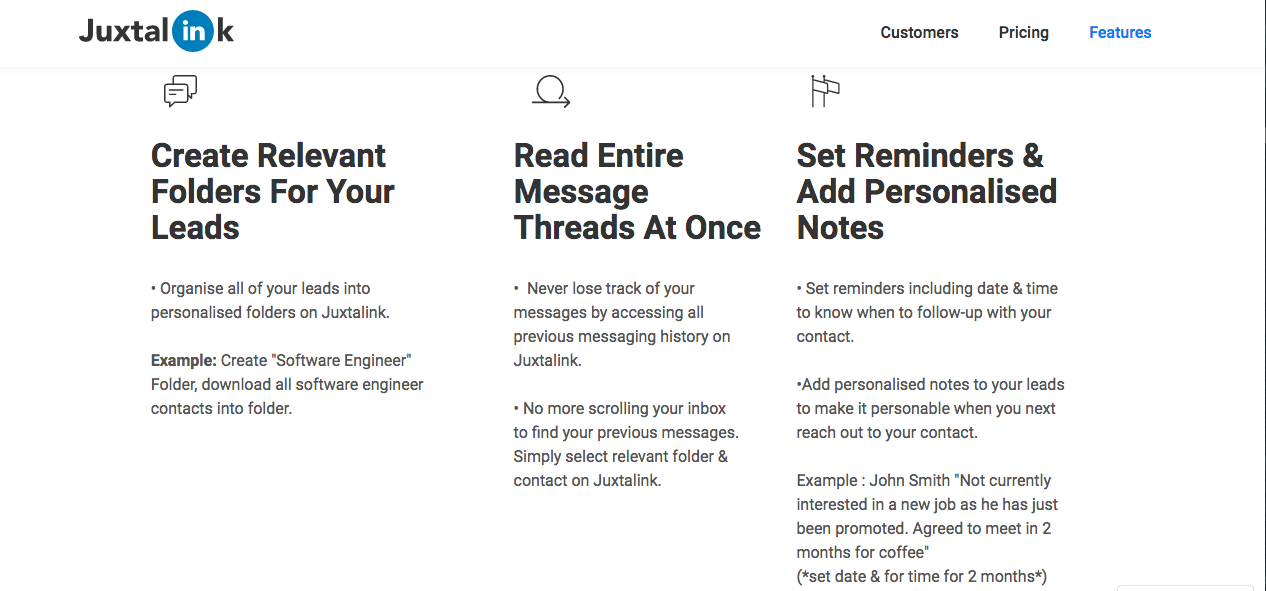 Juxtalink is a simple to use software tool that helps: 1. Import your leads into specific folders. 2. Manage your relationships by setting reminders & adding personalised notes. 3. Gives you easy access to all your previous messaging history & threads without having to scroll through your inbox to find your contacts. Our tool is easy and simple to use. For a few bucks a month you can organise & manage your entire LinkedIn network with Juxtalink , giving you more focus on building long term meaningful relationships.