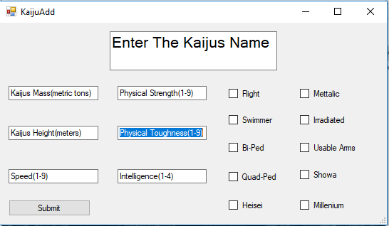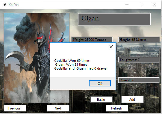 This is version one of Kaidex, a Kaiju ranking and battle simulation program.
