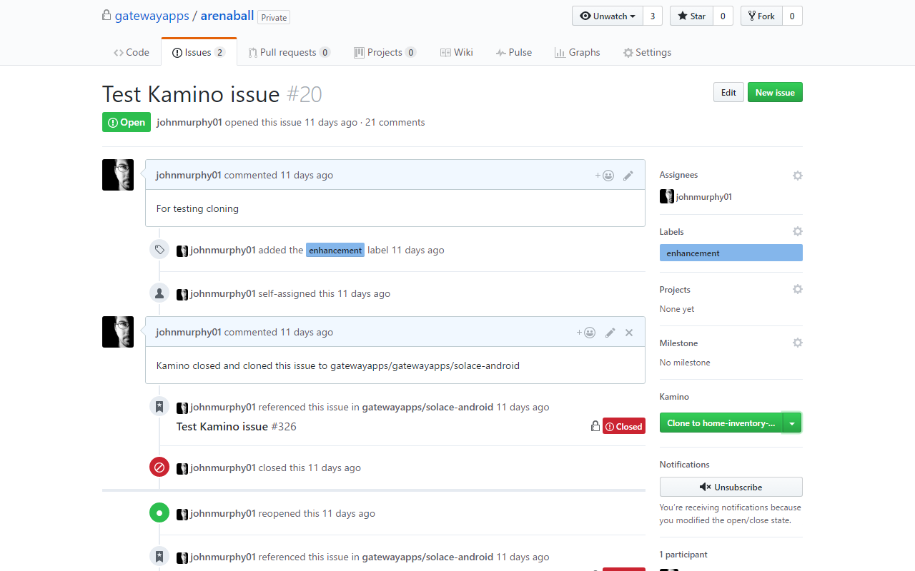 Kamino is a Chrome extension that is used to clone Github issues from one repository to another. Go to an issue page and click "Clone issue to", choose a new repository and the original item will be closed and cloned to the new repository you have chosen. This tool is very handy for feedback repositories whose issues need to be distributed to the actual project repository.