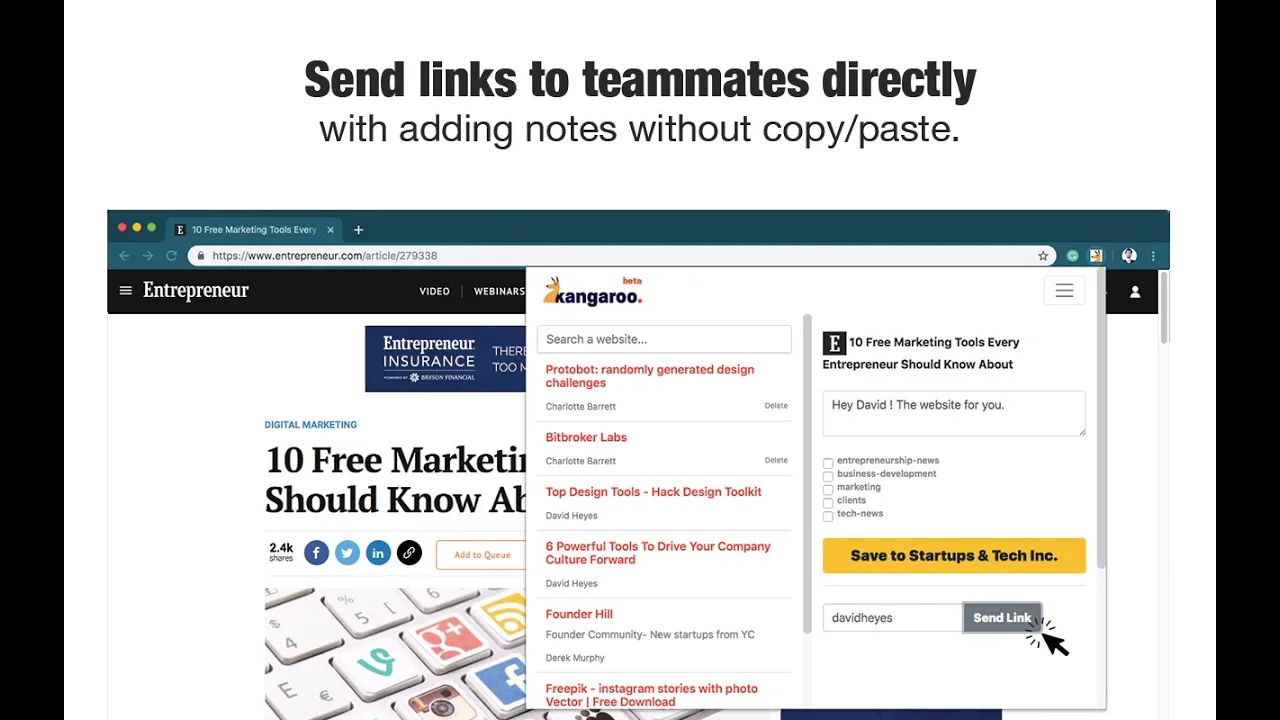 Teams can use important links more effectively. Take links inside the collections or send to teammates in one-click. Never get annoying notifications. Hop to it! -Save useful web contents on the shortest route. ( in one-click ) -Send important web contents by adding notes to teammates faster and easier. ( in one-click ) -Find previously visited links in a few seconds, revisit and discuss. Store useful web contents via kangaroo and build a web library for your team. Beta is available now. Try for free now: https://usekangaroo.com