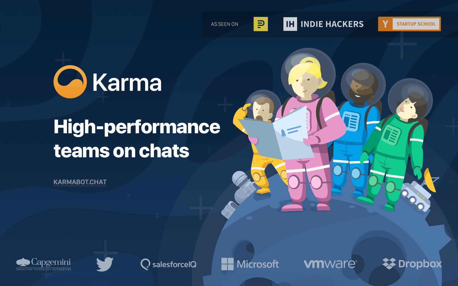 Nowadays, people often feel unappreciated at work. Karma is on the mission to end that. We simply help people to say ‘thank you’ more often and connect with each other. - Share micro-feedback instantly - Set real-life perks and rewards - Engage with your team and gain valuable insights - Analyse appreciation and praise activity through reports - Reinforce long-term vision and goals - Enable and propagate your company values 1,000+ teams who use Karma for daily appreciation, recognition and rewards. 100,000+ happy customers, 1M+ karma sent to date. Notable clients: VMWare, Twitter, Expedia, Toyota, Capgemini, SalesforceIQ, Deloitte Digital, Nintendo, AMD Team, Washington Post, SignalCo, Smartsheet, Red Hat, Inc., Walmart, BuzzFeed, Dropbox, PwC ICC, Hi5 Studios, TLC. Karma Pro requires a paid subscription and comes with a 30-day free trial. Karma Pro requires a paid subscription and comes with a 30-day free trial. Contact developers at [email protected]