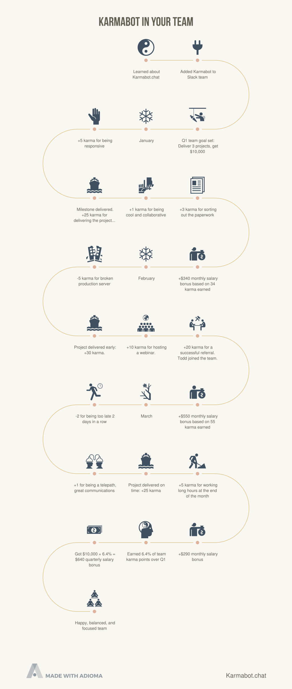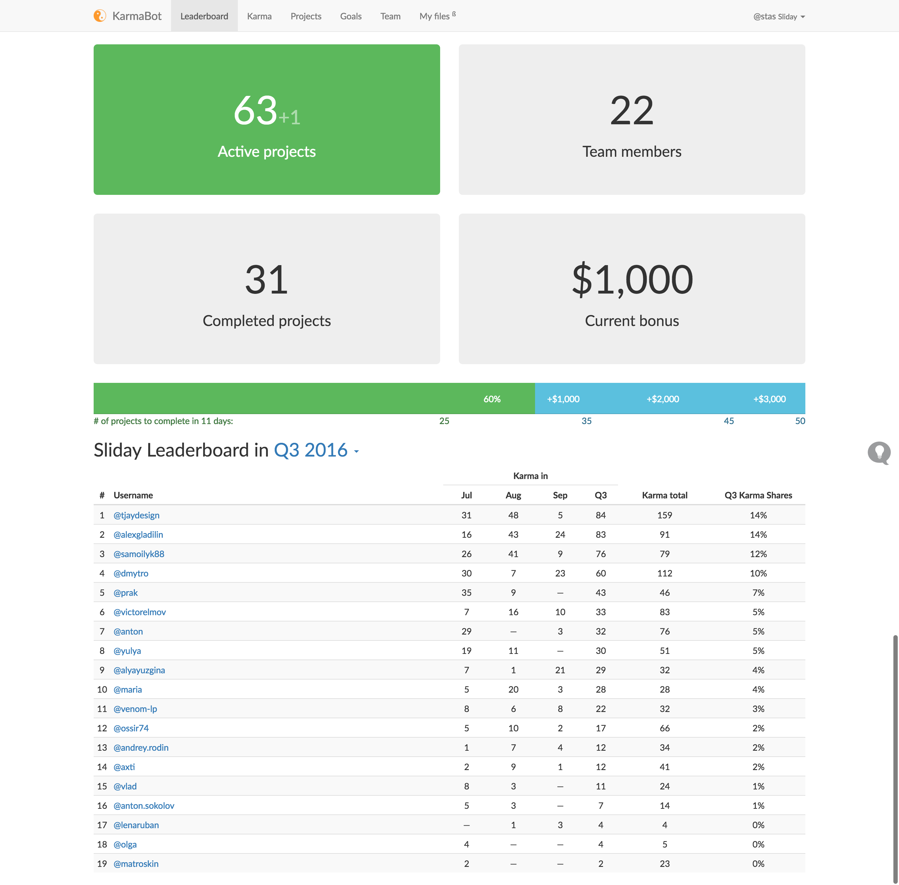 Build stronger, happier teams on Slack with Karmabot. Set goals, track performance and reward excellence. We have developed Slack bot to improve engagement and reward excellence. Reward > @john ++ for being super-responsive Set monthly salary bonuses based on Karma points. Engage > @sarah 3++ for helping in fixing a tricky bug Inspire team members to share some Karma between each other. Deliver > #new-app 20++ Milestone delivered early Give extra points to the teams for shipping the product faster. Achieve > @li has 49 karma in Jul, Q3 12% karma shares. Set quarterly goals and let people see their performance comparing to their colleagues.