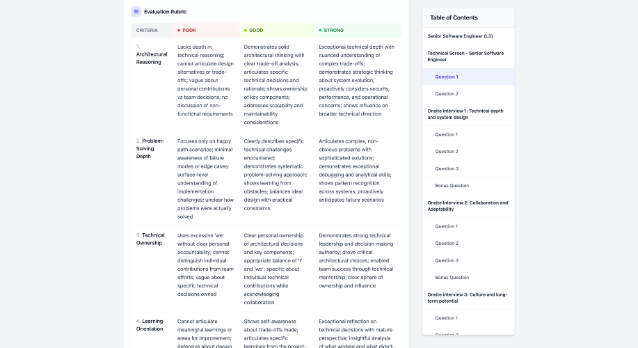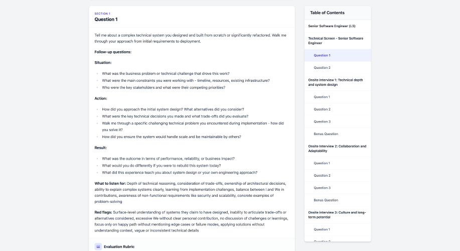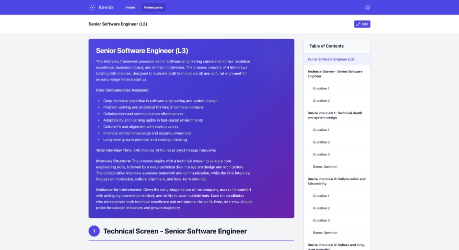 The best interviews don't happen by instinct, they happen by design. Keenix gives you what elite companies use: a structured interview framework tailored to your exact situation. Describe your role, and you'll get the questions, scoring rubrics, and red flags that turn hiring anxiety into hiring confidence. You won't get generic questions from a database. Instead, you'll have a framework that reflects the real differences in your situation. For example, a senior PM at a 5-person post-seed startup should be evaluated with different criteria than PM number 12 at a 200-person Series C. The questions, scoring rubrics, and red flags are all different. Keenix adapts to all of this. WHAT CHANGES: → You walk in knowing exactly what to ask at each stage → You have scoring rubrics that define "excellent" vs "poor" for THIS role in THIS environment — no more gut feeling → You spot red flags specific to the seniority and industry before they become 6-month problems → You compare candidates on evidence, not impressions → You make hiring decisions with confidence, not anxiety HOW IT WORKS: 1. Describe your hiring context (30 seconds) 2. Get a framework adapted to your reality (under 5 minutes) 3. Interview with clarity and confidence Designed for founders and managers who can't afford to make hiring mistakes.