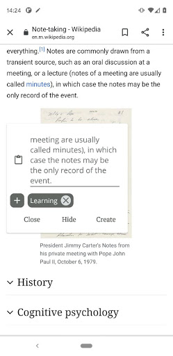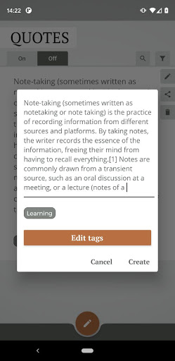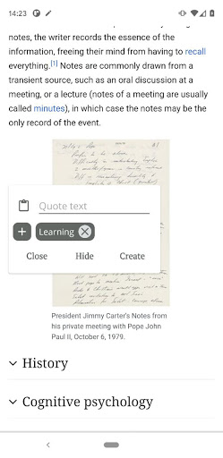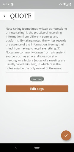 This app tailored specially for those, who want to take notes on smartphone during reading process. With special quote-creating overlay widget it allows to take notes without switching reading and noting apps in a background of smartphone.
