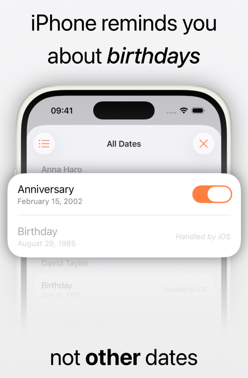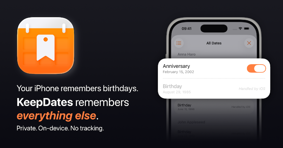 iOS reminds you about birthdays, but ignores every other date in your contacts. KeepDates is a simple iPhone app that fixes that. It automatically finds anniversaries and other saved dates, lets you review them, and adds them to your calendar with reminders. Everything runs on-device. No accounts, no tracking. It’s designed to feel like a missing system feature - simple, automatic, and out of the way.