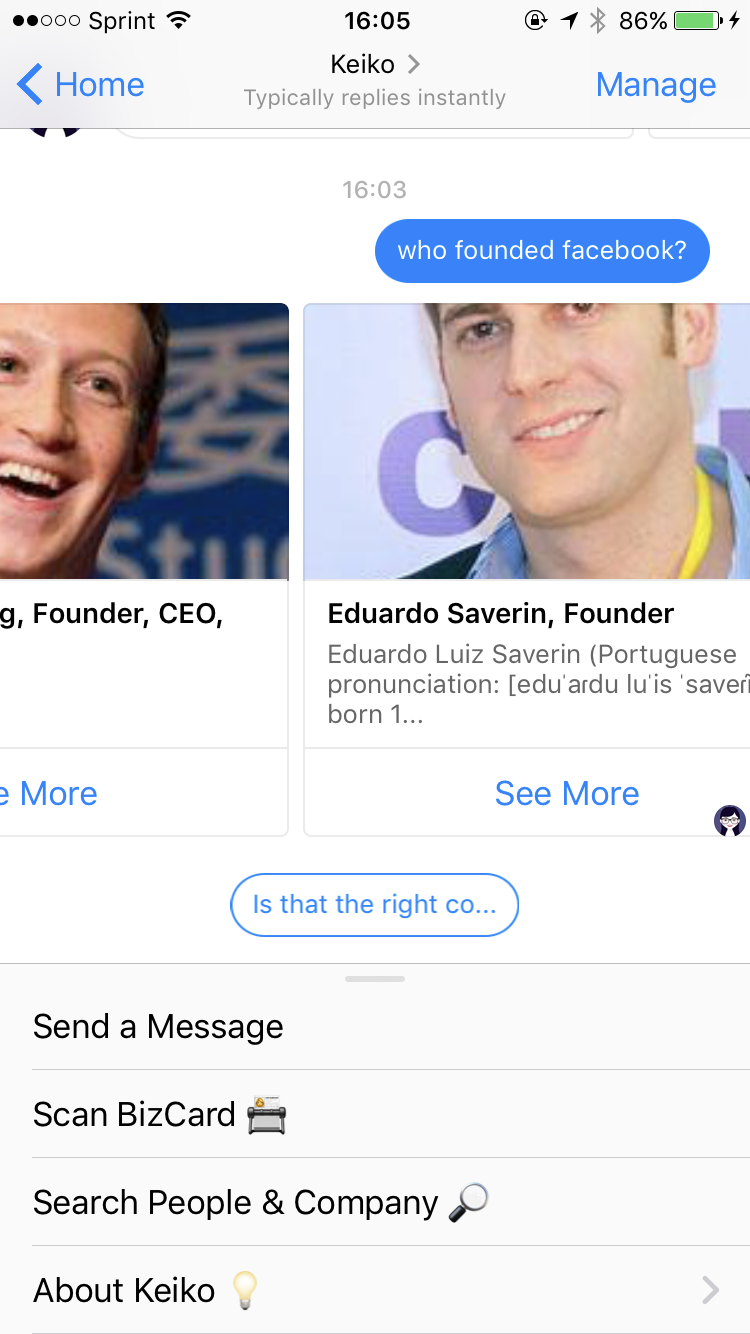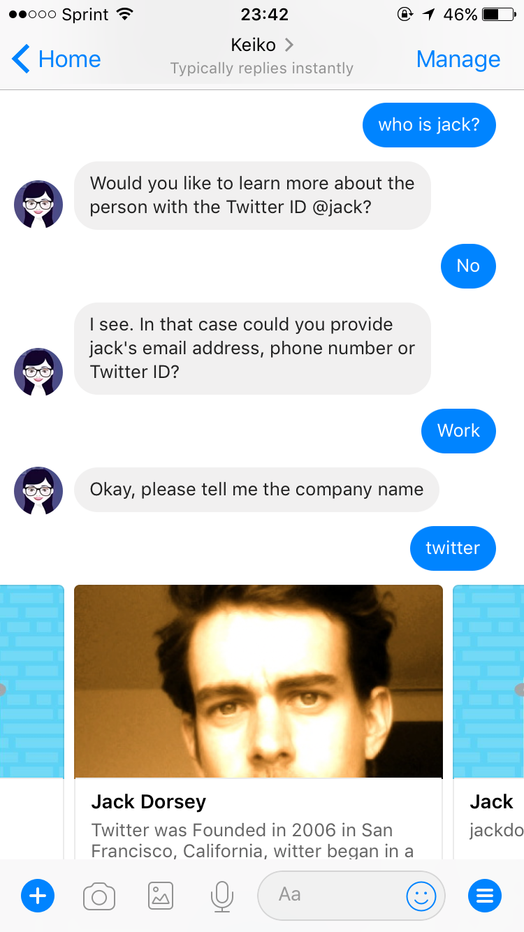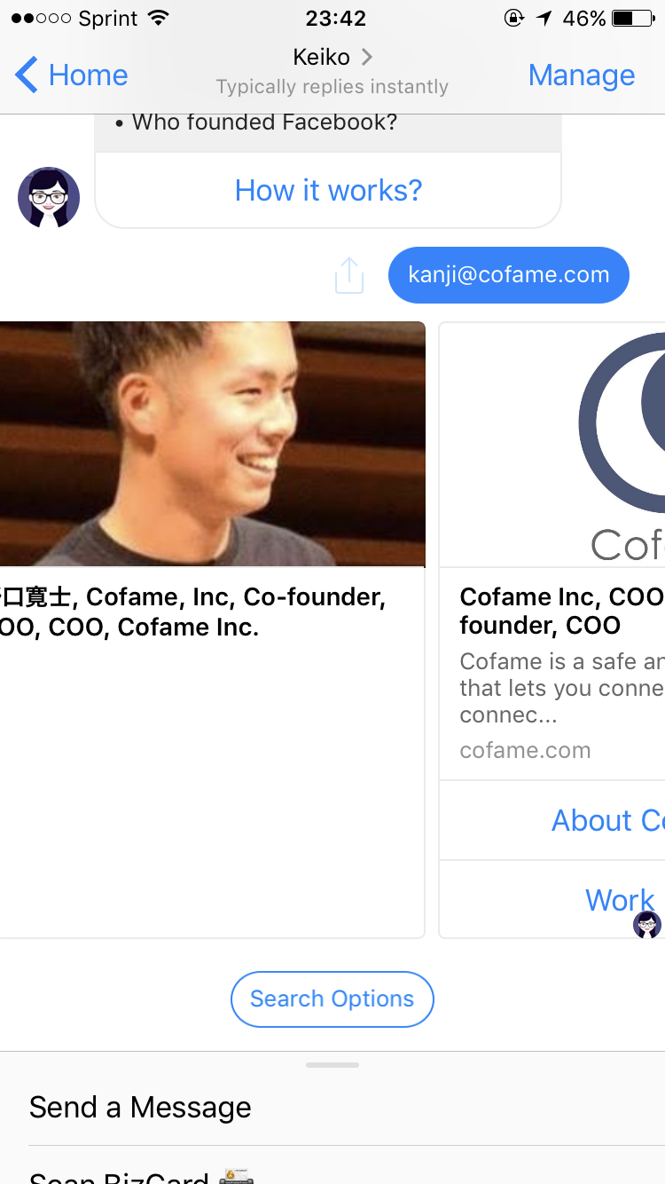 Keiko is a fun and interactive chatbot that can help you find meaningful information about people and companies instantly. No more sifting through pages of search results, you can just ask her questions like: - Who is Dan Siroker? - Where is Square? - Show me Mark Zuckerberg's Facebook posts Yes, just like how you would ask your personal assistant to look things up for you. In this beta Keiko works primarily on the Facebook Messenger (Web version and the app). You can start conversing with her just by following this link http://m.me/keiko.cofame and clicking on “Get Started” at the bottom. I hope you will enjoy your conversations with Keiko. Please feel free to send your thoughts directly to me or to our team at [email protected]. Your feedback is greatly appreciated!