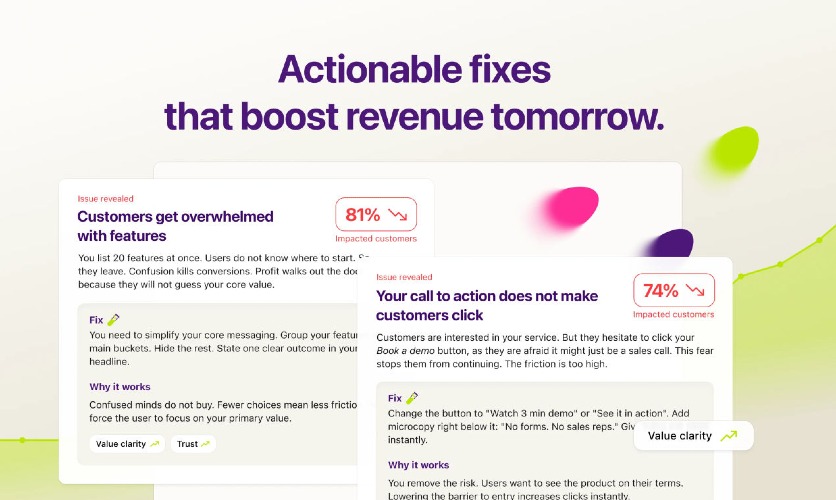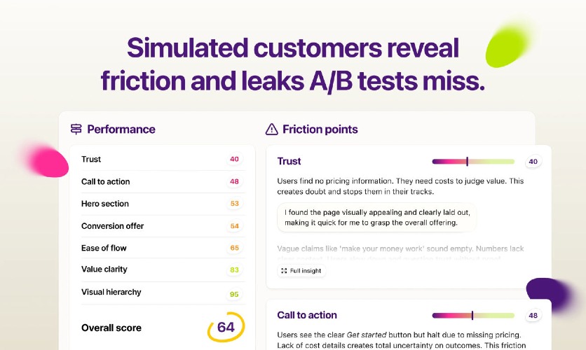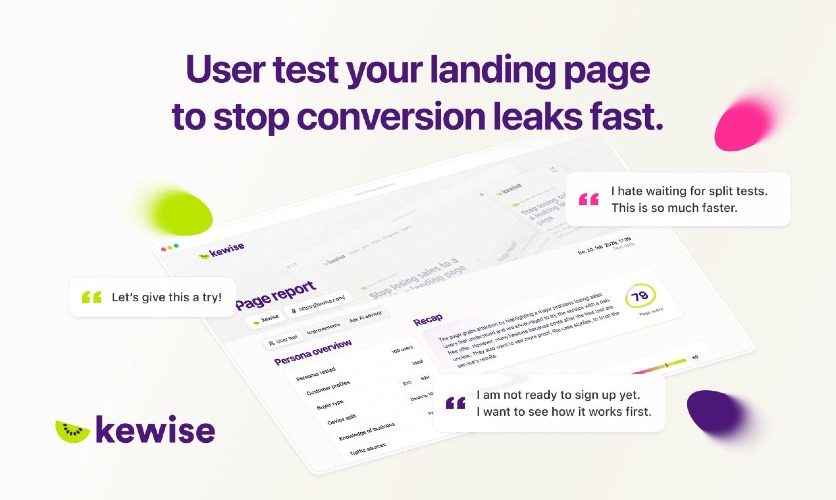 Test any landing page in minutes with AI-simulated customers. They reveal hidden friction, leaks and confused moments that A/B tests miss. No traffic needed. No weeks of waiting. See if customers instantly get and trust your offer – then get a clear list of critical fixes before blowing your ad budget. Kewise replaces slow, expensive user testing: try free with 5 customers. Upgrade anytime to 100 ideal customers and get statistically reliable insights no traditional user test can match.