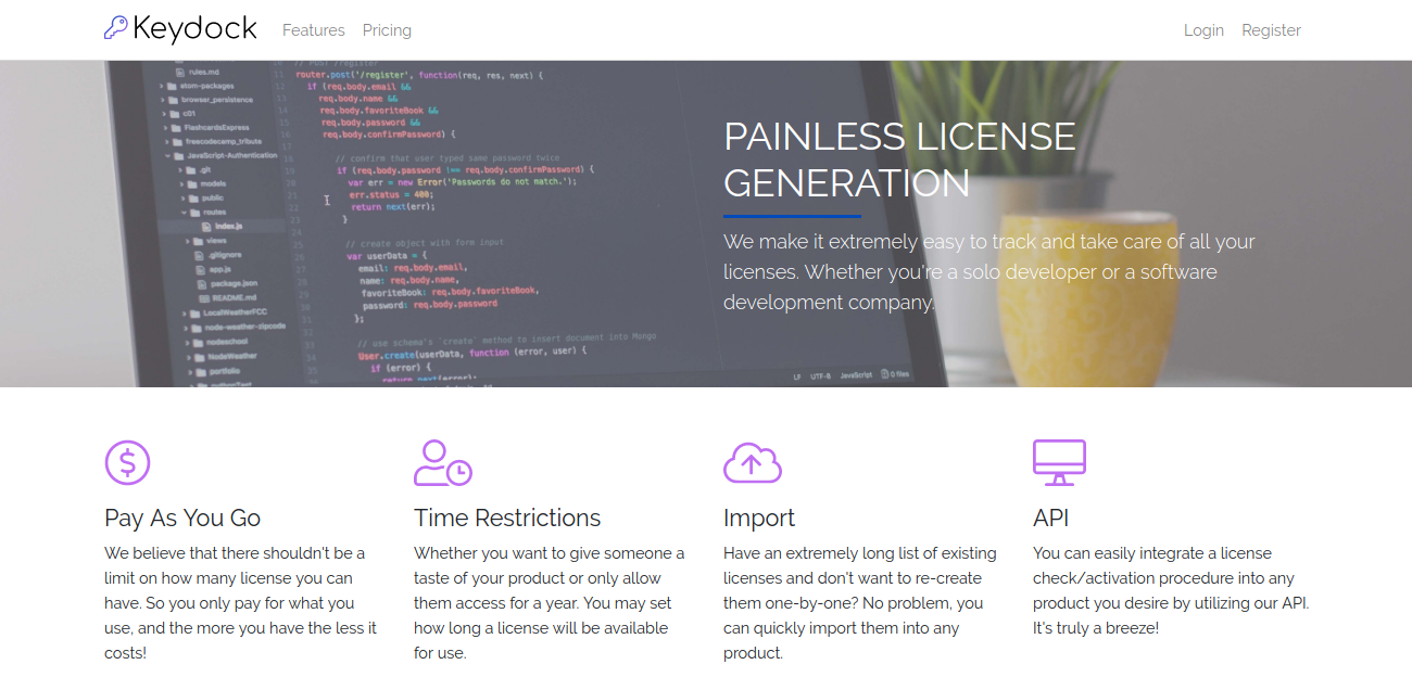 Pay As You Go We believe that there shouldn't be a limit on how many license you can have. So you only pay for what you use, and the more you have the less it costs! Time Restrictions Whether you want to give someone a taste of your product or only allow them access for a year. You may set how long a license will be available for use. Import Have an extremely long list of existing licenses and don't want to re-create them one-by-one? No problem, you can quickly import them into any product. API You can easily integrate a license check/activation procedure into any product you desire by utilizing our API. It's truly a breeze!