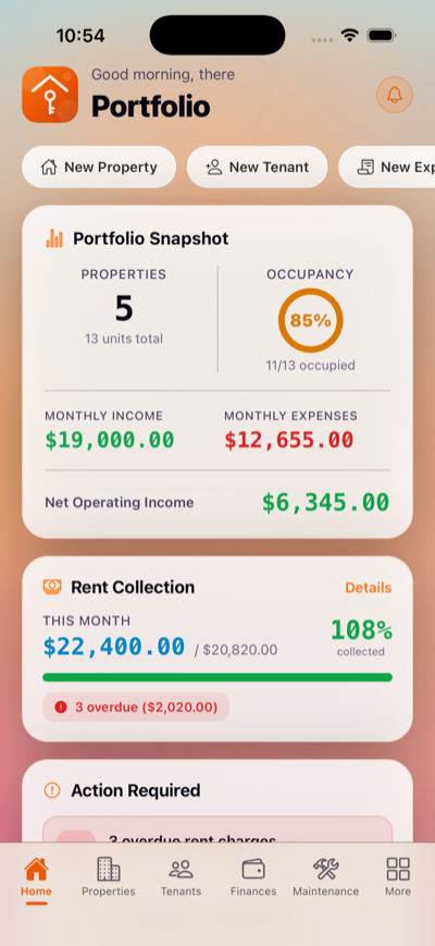 AI-powered rental property management, simplified. On-device AI helps you track rent, manage tenants, log maintenance, and run P&L reports. Built for landlords with 1–20 units.