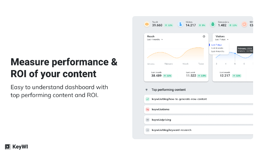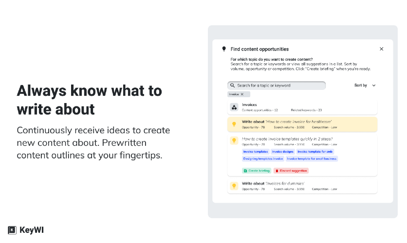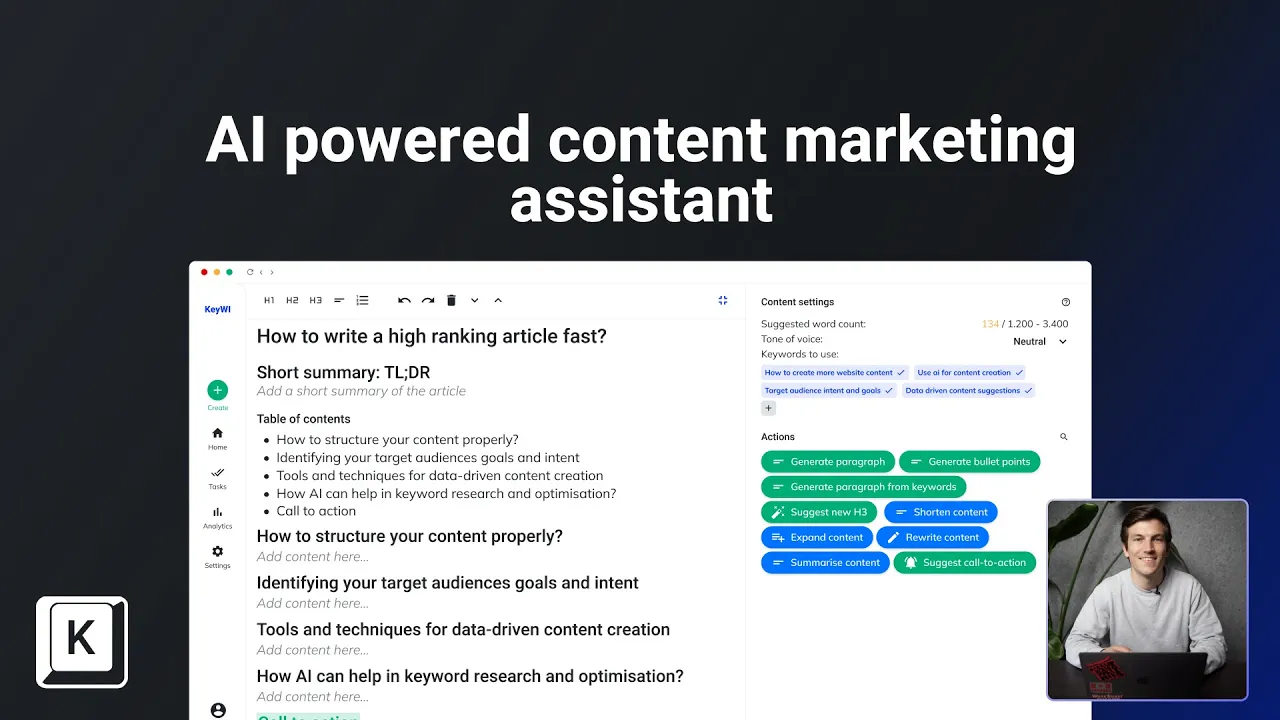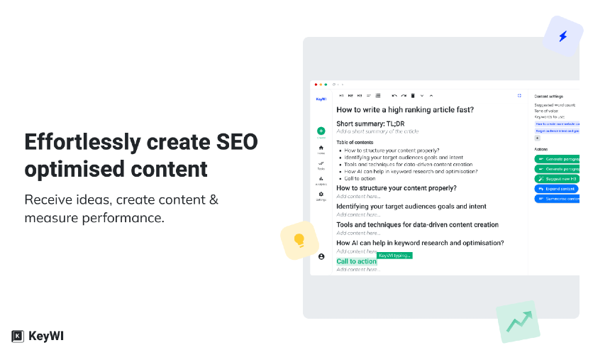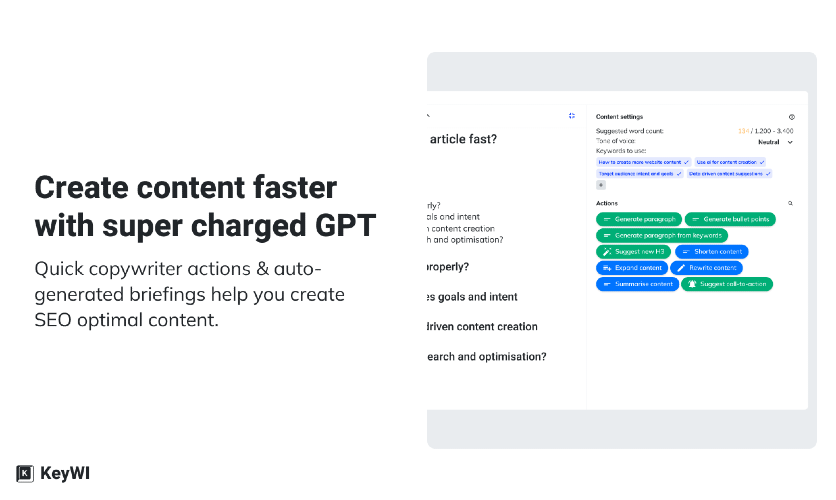 Marketers in SMB are limited in time and expert knowledge, making it challenging to properly perform a wide variety of tasks among which are SEO, content creation and analytics. Even with the help of GPT-3/ChatGPT. KeyWI guides marketers by supercharging GPT-3 to effortlessly create SEO-proof content and measure its performance. KeyWIs AI research algorithm eliminates the need for time-consuming keyword research & competitor analysis. A GPT powered content editor guides in producing SEO-optimised content in minutes, and a user-friendly dashboard allows for measuring ROI of content.