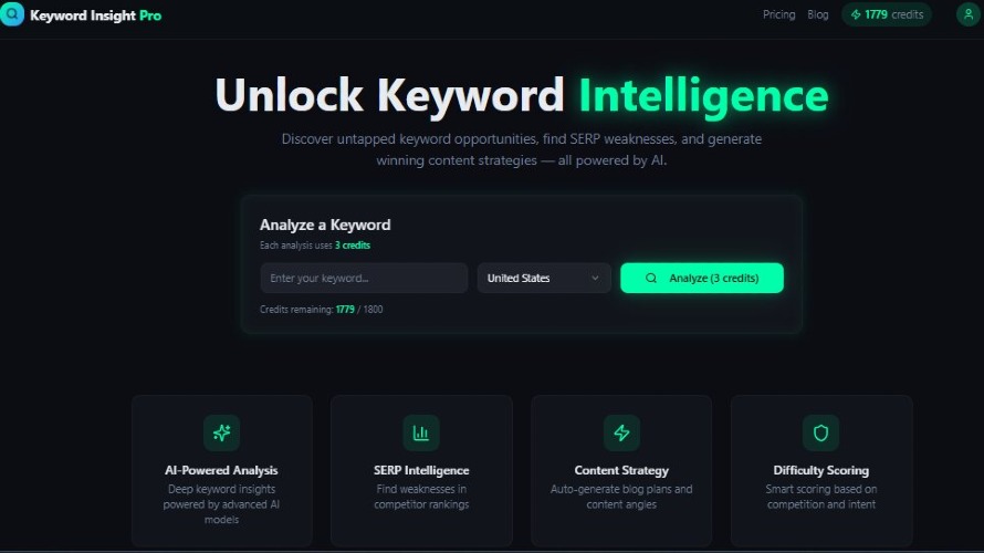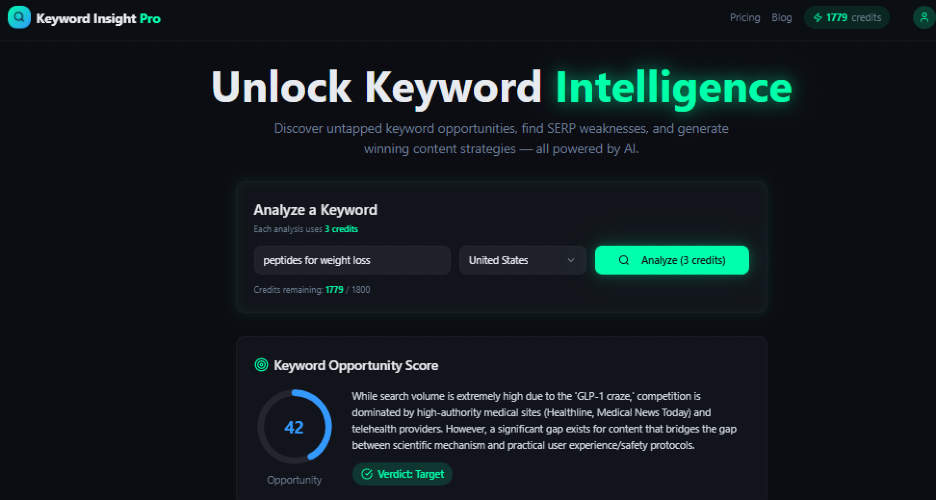 Keyword Insight Pro is an AI-powered keyword intelligence platform that goes beyond traditional keyword research. It helps marketers uncover untapped keyword opportunities, analyze real SERP weaknesses, and build content strategies that actually rank. Unlike basic tools that rely on misleading keyword difficulty scores, Keyword Insight Pro delivers a Smart Difficulty Score — powered by search intent, competition quality, and ranking feasibility — giving you a much more accurate decision on whether to target or skip a keyword. Get deep keyword insights, competitor gaps, and high-converting content angles in seconds. From topic clustering to ready-to-use blog plans, every analysis is designed to save time and eliminate guesswork. Simply run an analysis using credits and get actionable, data-backed insights to rank faster and smarter.