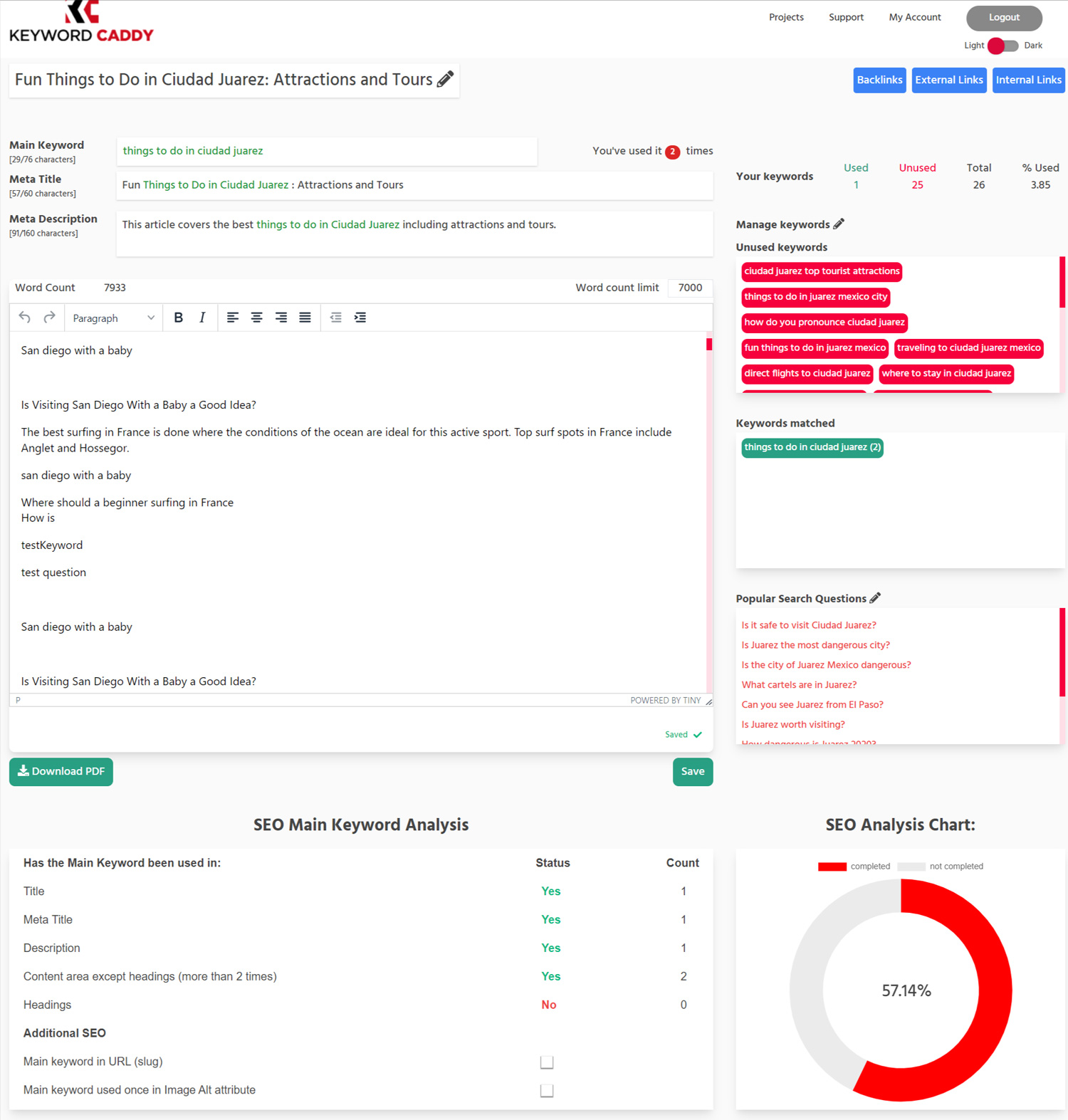 Welcome to SEO made simple. KeywordCaddy increases your productivity and streamlines SEO management with visual automated tools that will help you rank your content at the top of search engines. Track keyword use No more spreadsheets! Paste the keywords you want to use in the allocated box and as you write your article we’ll tell you what keywords you’ve used and where, and which ones you still need to include. Once the post is ready you’ll see where they are and can quickly make any changes you deem necessary (have you included keywords in the subtitles ?). Quickly improve the SEO of existing articles We like simple, and know you do too. Import your existing article and target keywords and our content analyzer will automatically highlight what keywords you’ve used and where, and which ones are missing. You’ll immediately know what you have to focus on, saving around 75% of the time you would normally need to do this! Have you answered frequently asked questions? No more spreadsheets! Paste the keywords you want to use in the allocated box and as you write your article we’ll tell you what keywords you’ve used and where, and which ones you still need to include. Once the post is ready you’ll see where they are and can quickly make any changes you deem necessary (have you included keywords in the subtitles ?). Keep those details in check. Have you optimized your meta tags? Reached your target article word count? Did you forget to check for duplicate keywords? Don’t worry, we do this for you. Everything counts in the road to SEO success, so we’ve made sure you leave nothing behind.