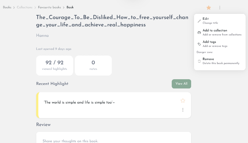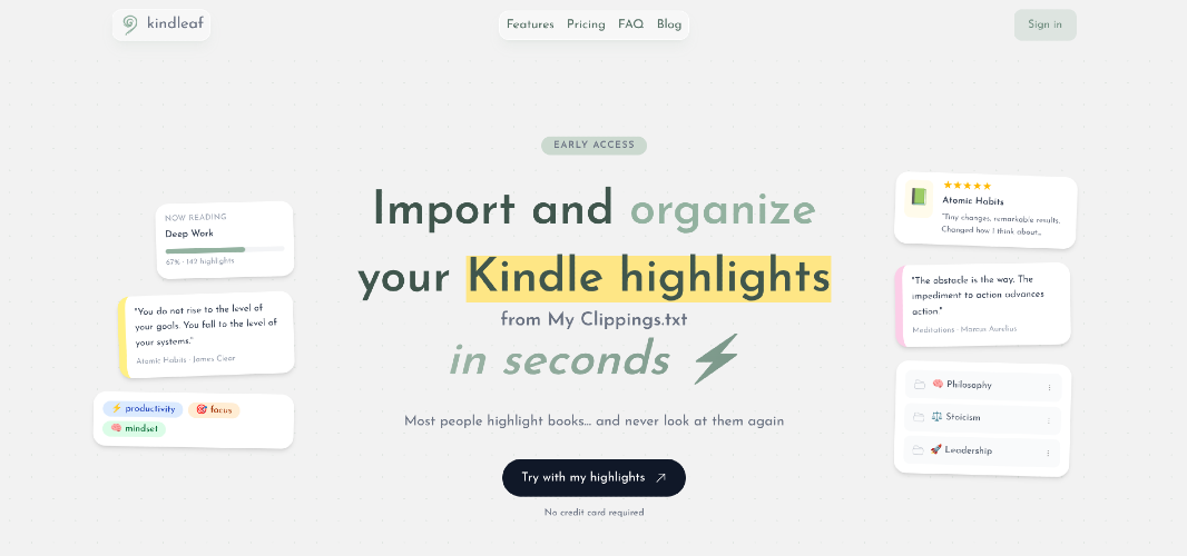 Kindleaf is a simple tool that transforms your messy Kindle highlights into a clean, structured, and searchable knowledge base. Instead of digging through a giant text file, you can upload your My Clippings.txt and instantly get organized insights from everything you’ve read. ⚡ Why I built this Kindle is amazing for reading — but terrible for revisiting what you’ve learned. All your highlights are stuck in one unstructured file: Hard to search Impossible to organize Easy to forget I wanted something that actually helps use knowledge, not just store it. 🚀 Features 📂 Upload your My Clippings.txt file 🔍 Search through all your highlights instantly 🧩 Clean, structured formatting (no more mess) 📚 Grouped by book ⚡ Fast and minimal — no clutter 🎯 Who is this for? Readers who highlight a lot on Kindle People building a personal knowledge base Developers, founders, students Anyone tired of scrolling through raw text