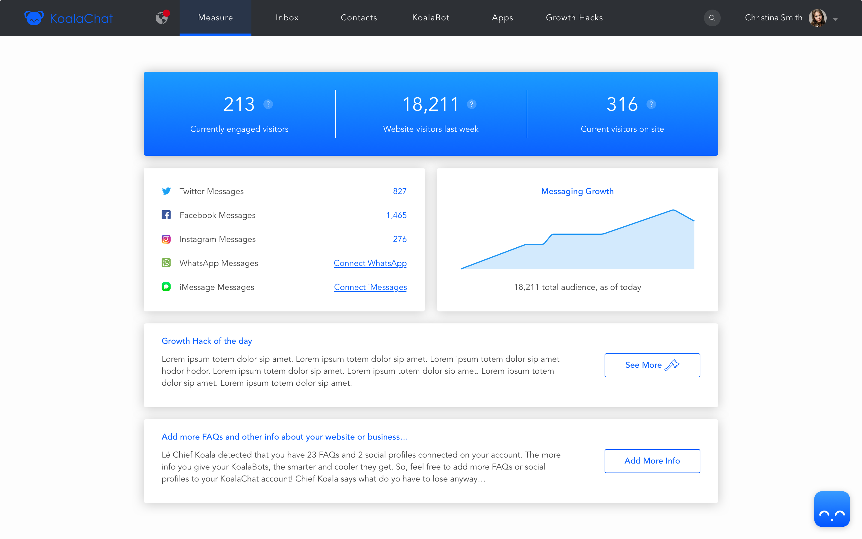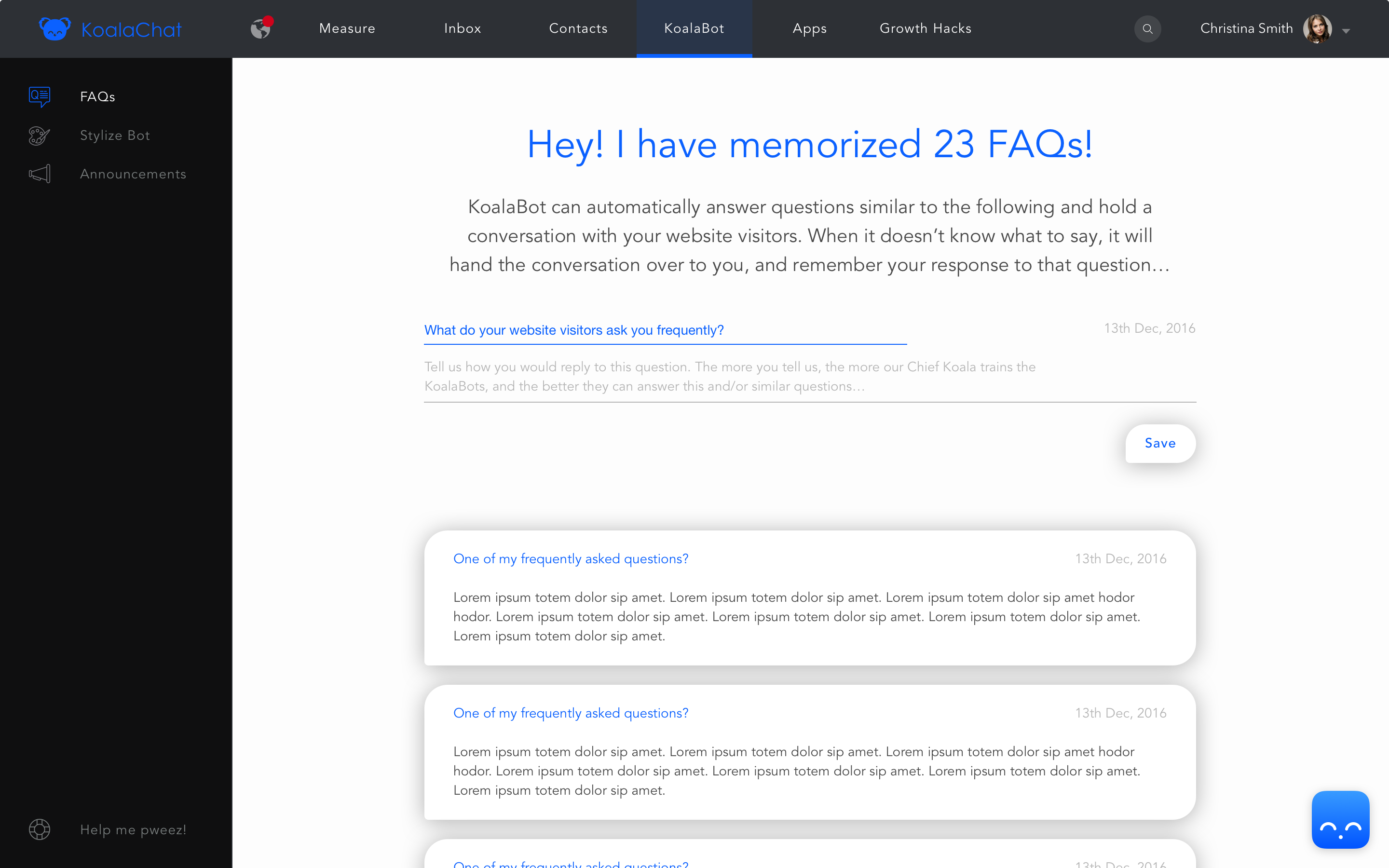 KoalaChat was founded by a couple-a-geeks and a cute koala out to solve a huge sales and customer service challenge for small business owners and ecommerce entrepreneurs. Team KoalaChat is a tiny group of developers who dig digital marketing and are passionate about getting the customer experience right. We are on a mission to create friendly live chat to engage your online customers and delight them with round-the-clock customer support. We want to make sure that you access every opportunity to get customer service bandwidth while focusing on growing your business. KoalaChat will give you an AI powered chat solution that learns on-the-go and adapts to the unique needs of your customers.