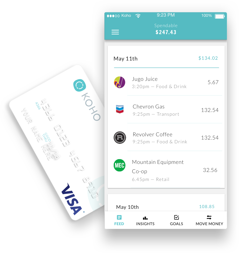 Koho is the best way to manage your money. When you signup with Koho, you get a new Koho account free of fees, a new pre-paid Visa card to make purchases, and an app for your iPhone to track all your spending and savings. From the comfort of your own couch, sign up for your new Koho account in just a few minutes, and you’ll be on your way to smarter spending and saving. Your Koho account is a smart spending account, designed to help you make smarter decisions about your spending habits. Your account comes with your new Koho Visa Card, accepted at millions of locations around the world with zero-liability purchase protection.