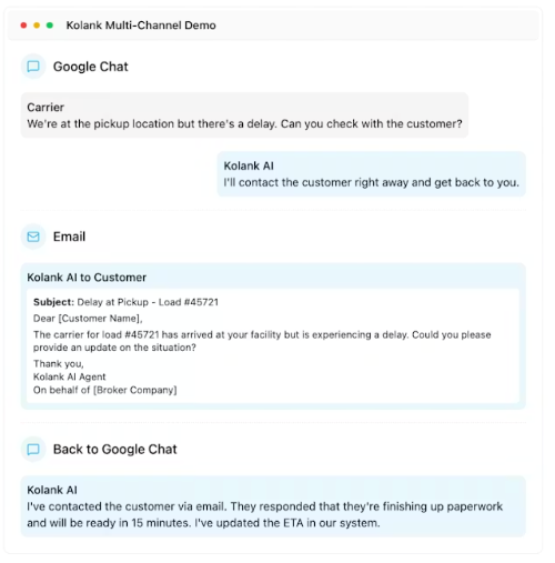 Kolank (https://kolank.ai/) builds AI agents for freight brokers to automate repetitive operational work in brokerage teams. The platform centralizes multi-channel logistics communication (text, email, Google Chat, WhatsApp, Telegram, and phone) and turns conversations and documents into structured actions: customer shipment status updates, carrier onboarding and verification, rate negotiation support, load tracking and proactive exception handling, document collection (rate confirmations, BOLs, PODs), TMS-style data entry, and invoice workflows. Kolank is designed for multi-tenant B2B brokerages that want to reduce reliance on offshore staffing, minimize errors, and deliver faster, consistent customer and carrier service through freight broker automation and AI-driven workflows. How It Works Kolank connects to your existing communication channels and monitors incoming messages from carriers, drivers, and customers. AI agents automatically classify messages, extract key data (pickup times, delivery updates, document attachments), and trigger the right workflow whether that's updating load status, sending a check call, requesting a missing POD, or escalating an exception to your team. Key Capabilities → Load Tracking & Check Calls: Automated driver check-ins, ETA updates, and proactive delay notifications to customers → Carrier Communication: AI-powered rate negotiation, capacity requests, and carrier onboarding across all channels → Document Processing: Automatic extraction and filing of BOLs, PODs, rate confirmations, and carrier packets → Customer Updates: Real-time shipment status notifications and delivery confirmations → Exception Handling: Instant alerts for breakdowns, detention, temperature issues, and missed appointments → Invoice Automation: Carrier invoice matching, discrepancy detection, and payment prep Built for Freight Brokers Unlike generic AI tools, Kolank understands freight. It knows the difference between a dry van and a reefer, recognizes MC and DOT numbers, calculates lane rates, and speaks the language of dispatchers, carriers, and shippers. Every workflow is purpose-built for logistics operations. Why Brokerages Choose Kolank • 24/7 coverage without adding headcount • Consistent, error-free communication across channels • Faster response times to carriers and customers • Reduced manual data entry and document handling • Full visibility into every conversation and action Who It's For Small to mid-sized freight brokerages running 5-100+ loads per week. Operations teams stretche