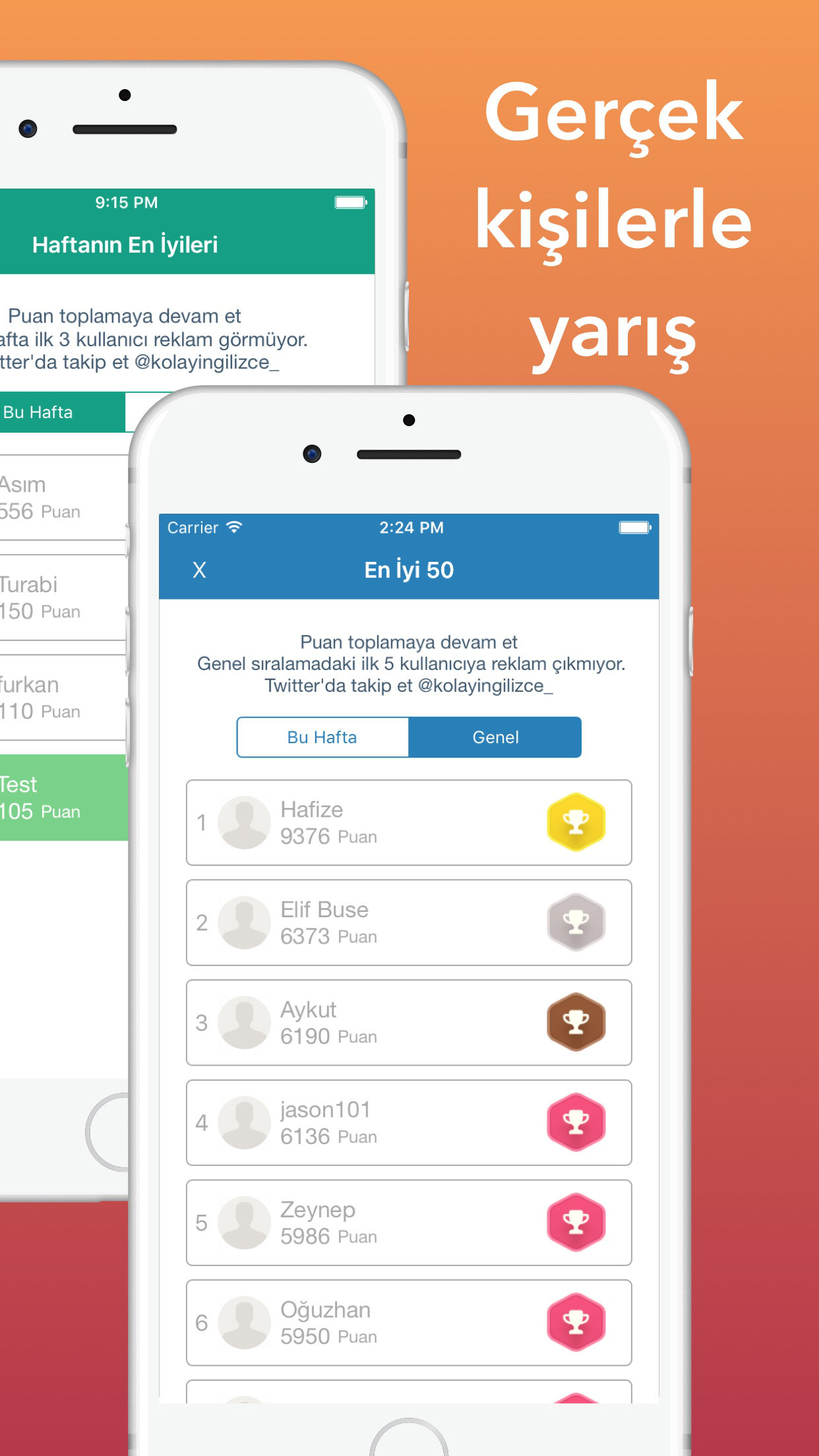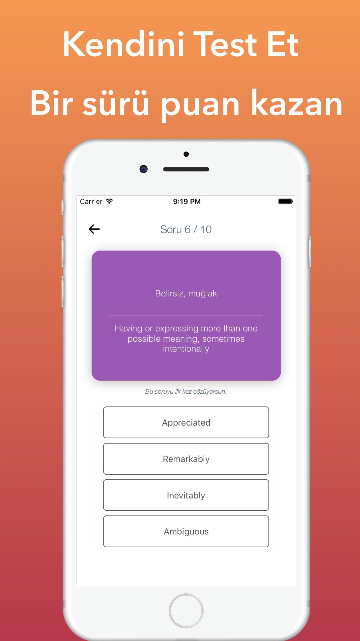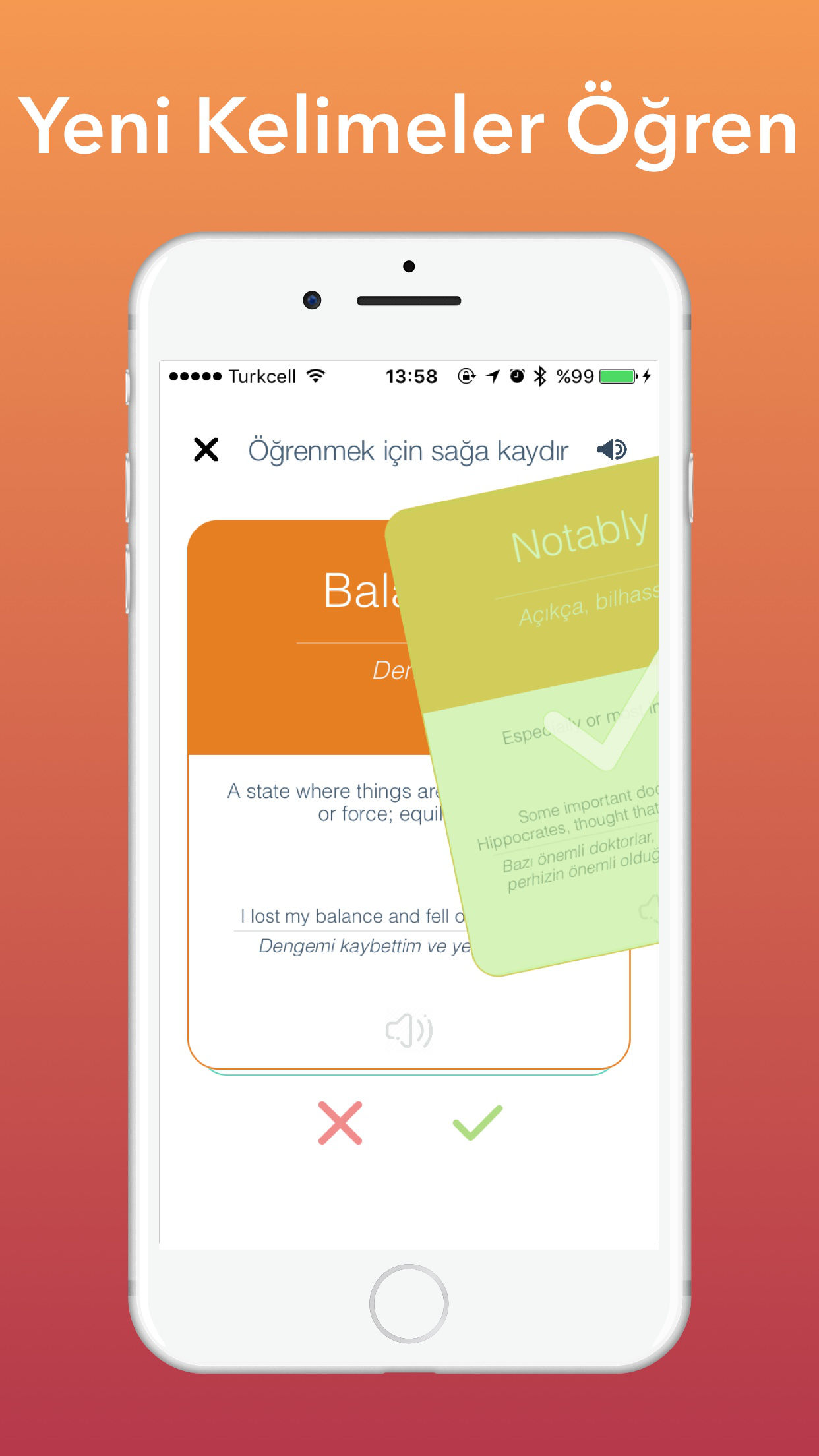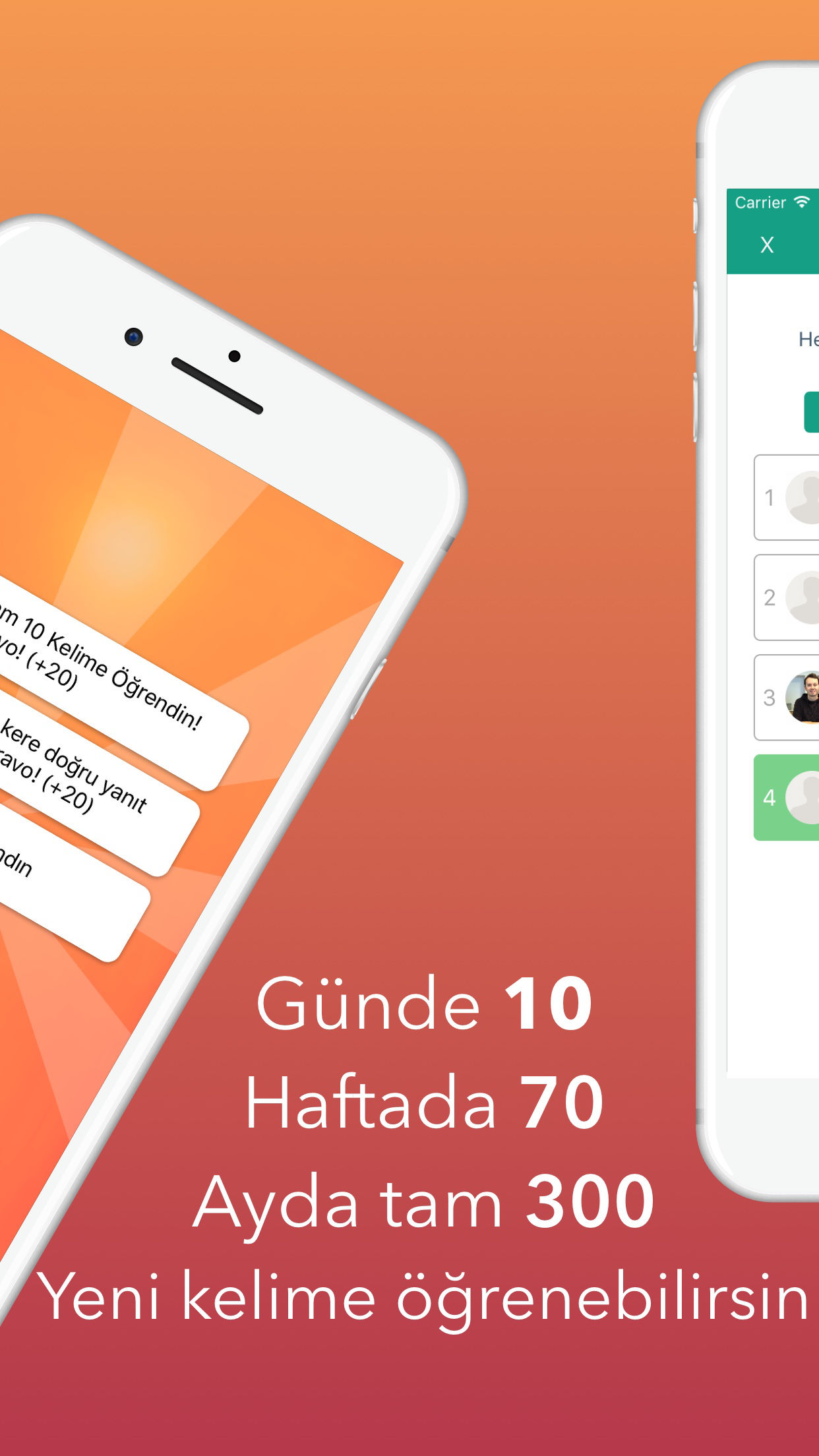 Ingilizce Kelime Ögrenmek hiç bu kadar kolay olmamisti. Her gün sadece 5 dakika ayirarak, Günde 10, Haftada 70, Ayda tam 300 kelime ögrenebilirsin. Özel gelistirilen akilli tekrar etme algoritmasi ögrenmekte zorluk çektigin kelimelere odaklanarak kelimeleri kolayca ögrenmeni saglayacagiz. Kelimelerin anlamlarini ve örnek cümle içinde kullanimlarini incele, ögrendim dedikleri saga kaydir. Bunlar daha sonra tekrar etmen için karsina çikacak unutma :) Ögrendigin her kelimeden ve çözdügün her testten puan kazanacaksin. Özel bonus puanlari kaçirma, puanlarini katla. Kazandigin puanlarla arkadaslarinla yaris, siralamada zirveye oyna. #Kullanici Yorumlari# djbanuatilgan Harika bir uygulama kelime hazinemi gelistiriyor! Njkd güEl Uygulama güzel örnek cümlelerle akilda kalici bir sekile ögretiyor, harika tebrikler :) berol_ Çok hos ve ögretici bir uygulama Bulent Camakli Baya keyifli ve kullanisli uygulama, hergun kisa hedefler, yolda okulda serviste heryerde taskini tamamlayabilirsi