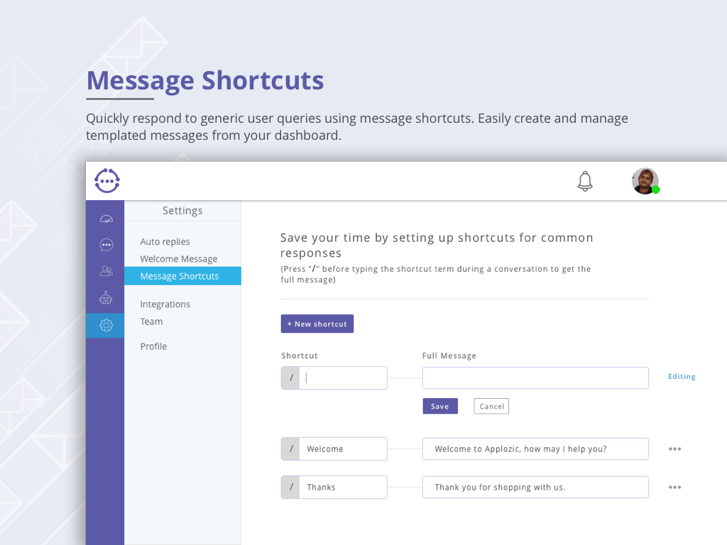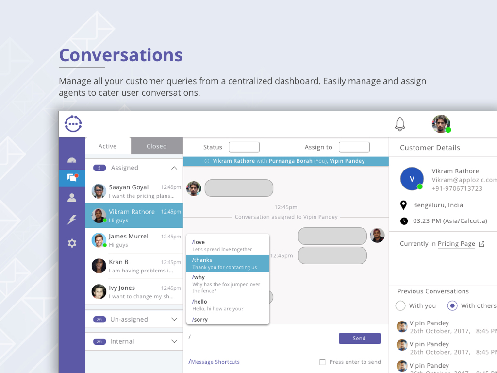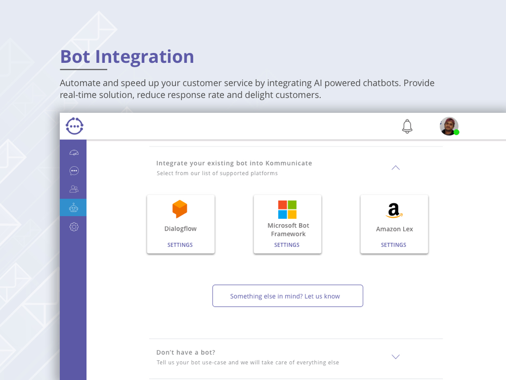 The way customer conversations and support is done has been broken, redundant, and time and cost inefficient. And Kommunicate aims to correct it. Kommunicate is a modern customer communication software for real-time, proactive and personalized support for growing businesses. Kommunicate is a one-stop solution for all your customer support problems. Kommunicate comes with a bunch of features that ensures a delightful experience for your customers and helps you convert website visitors into active users: - Real-time support and live chat - Message shortcuts - Custom welcome messages - Bot integration - Internal conversations - Team management - Dashboard - Dynamic FAQs
