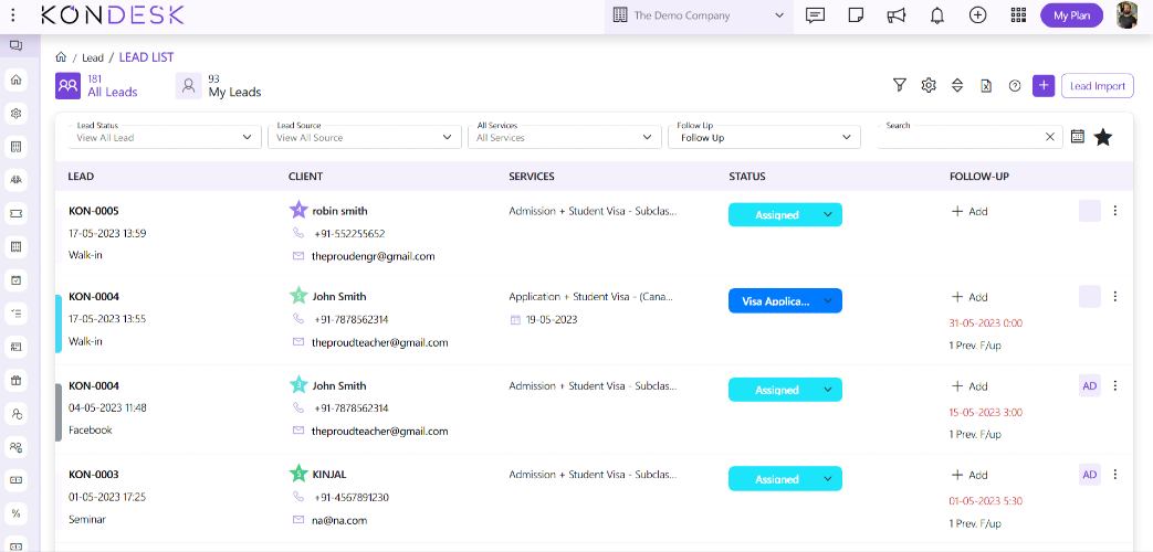 KONDESK CRM is developed for immigration agents and education consultants specifically. It’s industry-specific workflow allows agents to assure no step of your process is ever missed out. Document management is also easier as it records all the documents of each lead uniformly making it easier to access. Your consultant won’t have to switch between multiple tools for their day to day tasks as it integrates with the leading communication channels like Gmail, Yahoo, with payment gateways like Cashfree and Stripe, with lead sources like Facebook Lead form and Sulekha and a lot more. Overall, it provides 15+ integrations to aid your tasks. You can assure great service to your customers with the follow-up reminders. Every-time a follow-up is due, your consultant gets notified, hence no more lost leads. To make sure your process has no loops, smartly use the Lead Management and Reports feature. Embrace the power of KONDESK CRM and unlock new levels of success for your organization in these highly specialized industries.