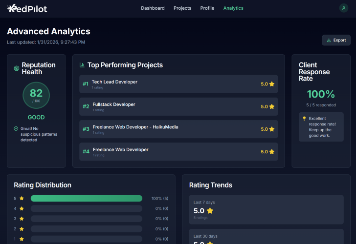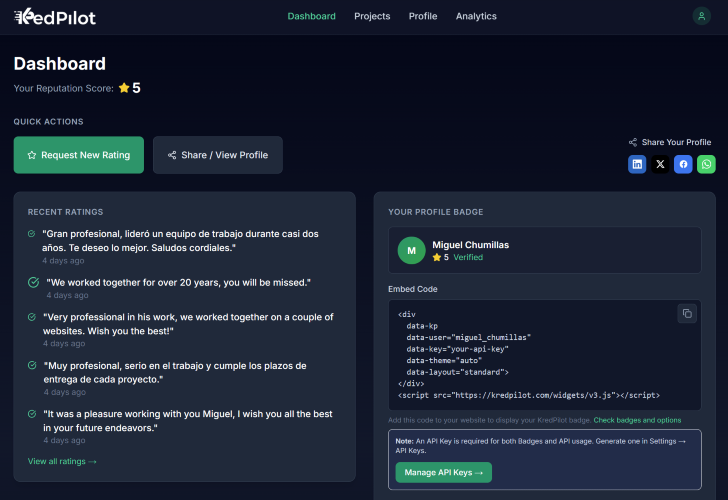 KredPilot is a portable professional reputation platform designed for freelancers, contractors, and independent professionals. Unlike platform-specific ratings that disappear when you switch marketplaces, your KredPilot reputation follows you everywhere.