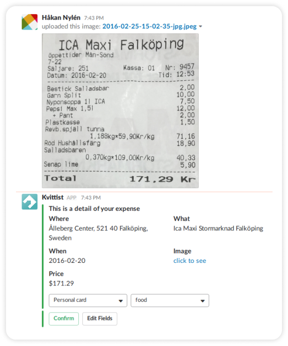 Kvittist let you use your slack chat to report your expenses anywhere, anytime. It uses machine learning to snap up the info of your sentence and create an expense for you. It can also generate an expense report from an image of the expense.