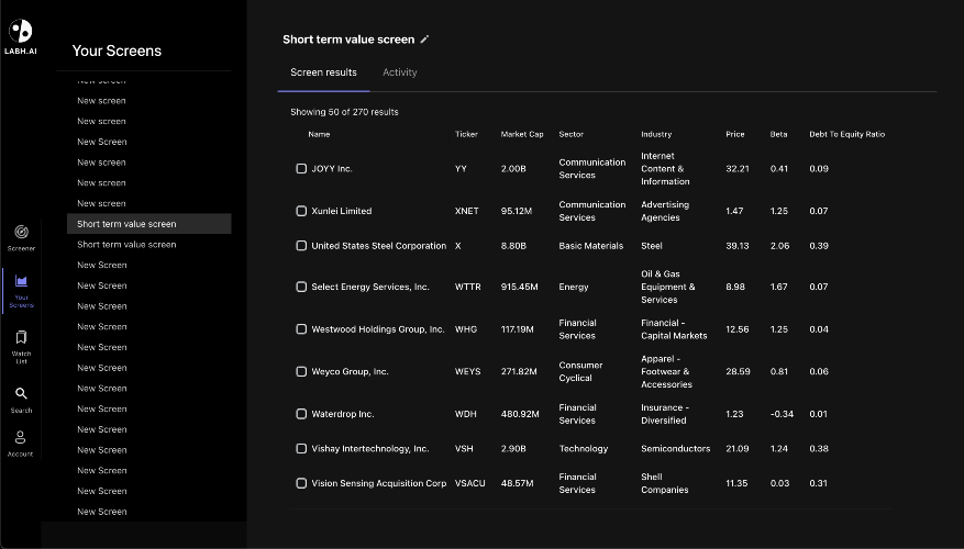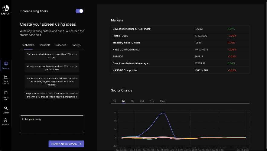 Introducing Labh.ai: AI powered stock screener and analysis tool 🚀 Discover Opportunities with Ease: Say goodbye to complex filters! With Labh.ai, simply enter what you're searching for in english and instantly screen stocks that match your investment themes. It’s trading made simple, smart, and streamlined. 📊 Visual Insights, Simplified: Transform how you view data with Labh.ai’s intuitive visualizations. Our platform brings your data to life, providing complex information in an easily digestible format at just a glance. 🔍 Dynamic Screening in Real-Time: Keep your strategies adaptive and sharp. Labh.ai continuously monitors your criteria, alerting you instantly when stocks no longer match, ensuring you're always in the loop. 📈 Empower Your Decisions with Expert Insights: Gain a competitive edge with unrivaled access to analyst ratings, price targets, notable investor activities, and more. Labh.ai doesn’t just provide data—it gives you insights. 🔔 Customized Intelligence Alerts: Personalize how you stay informed. Receive updates directly to your inbox on earnings calls and market shifts, keeping you ahead of the curve without overloading your day. More features coming soon: 📝 Trade Analysis, Redefined: Elevate your trading discipline. Record, analyze, and refine your strategies with actionable insights derived from your trade history. 🤖 Automated Technical Analysis: Explore automated chart analysis for all your screened stocks. Dive into price actions, indicators, and much more, all from one comprehensive platform. Labh.ai is more than just a tool—it’s a companion designed to navigate the complexities of the market with precision and insight. Whether you’re a seasoned trader or just starting out, Labh.ai equips you with everything you need for smarter, faster, and more effective trading.
