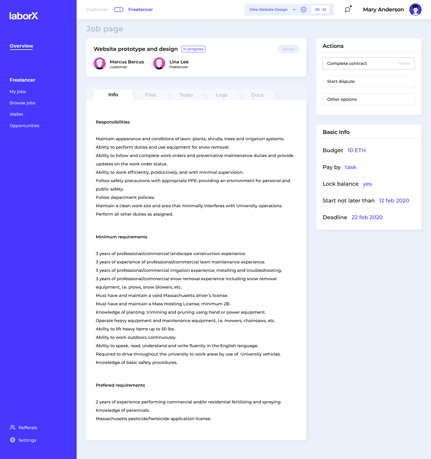 LaborX is a global recruitment platform that connects individuals with work opportunities, wherever they are based in the world, and enables them to get paid in crypto. The software offers efficient transactions and robust protections for both parties. LaborX’s Contract module allows employers and service providers to establish the conditions under which they will work together, including deadlines and payment terms. Users’ financial relationships are protected by digital escrow, which locks funds when the contract is signed and releases them upon satisfactory completion. This reduces the chances of payment delays and disputes. A Reputation module enables users to leave transparent feedback, allowing employers to select the most reliable candidates and service providers to access the best opportunities. In the event a disagreement, a Dispute Resolution service is offered to provide fair resolution.