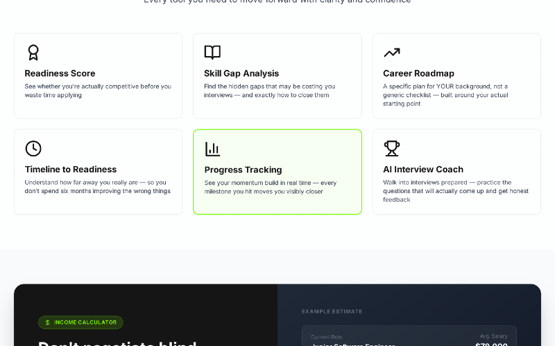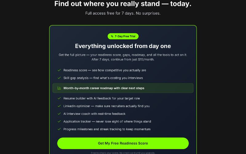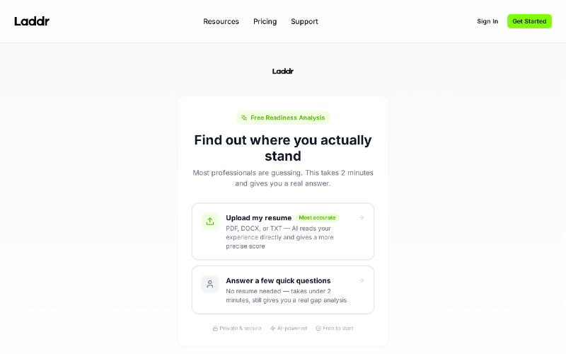 Laddr is an AI career readiness platform. Name your target role, upload your resume or answer 5 quick questions, and get a readiness score (0–100) with a ranked skill gap breakdown and a personalized roadmap.