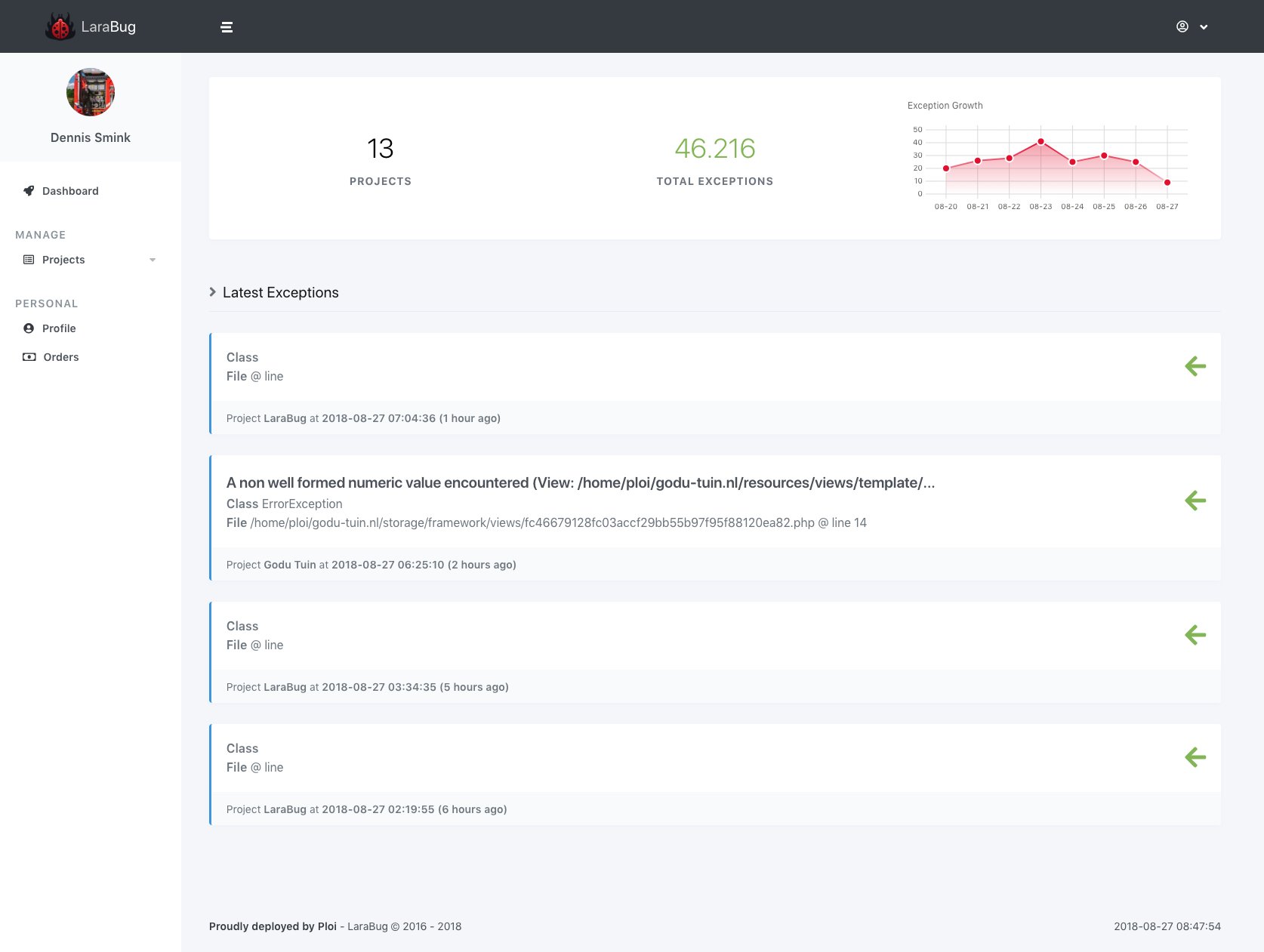 When creating and developing websites it is most common that your users do not always report bugs, certainly if you do not solve these errors you will lose (potential) customers. LaraBug will catch any exception generated in your application and collect this in a nicely formed dashboard for you. You have a complete overview over your exceptions per project. You can view the complete details about the exception including the stack trace and code piece with the actual line highlighted so you know where the code broke. If available, LaraBug’s package will also send along the user details (with Sentinel support!) so you know who’s it about. Sharing exceptions to solve with teammates or colleague’s is also no problem, just make your exception ‘Public’ inside the options tab in LaraBug which will allow URL sharing of your exception.