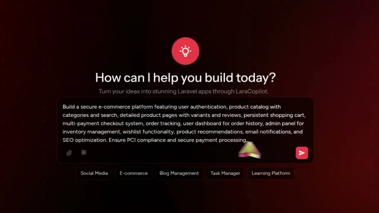 LaraCopilot is the world’s first Laravel AI Full Stack Engineer. It turns your idea into a full stack Laravel app in minutes with clean code, database setup, migrations, admin panel, GitHub sync, and one-click deploy. No lock-in. Built 100% with Laravel.