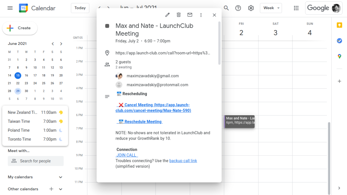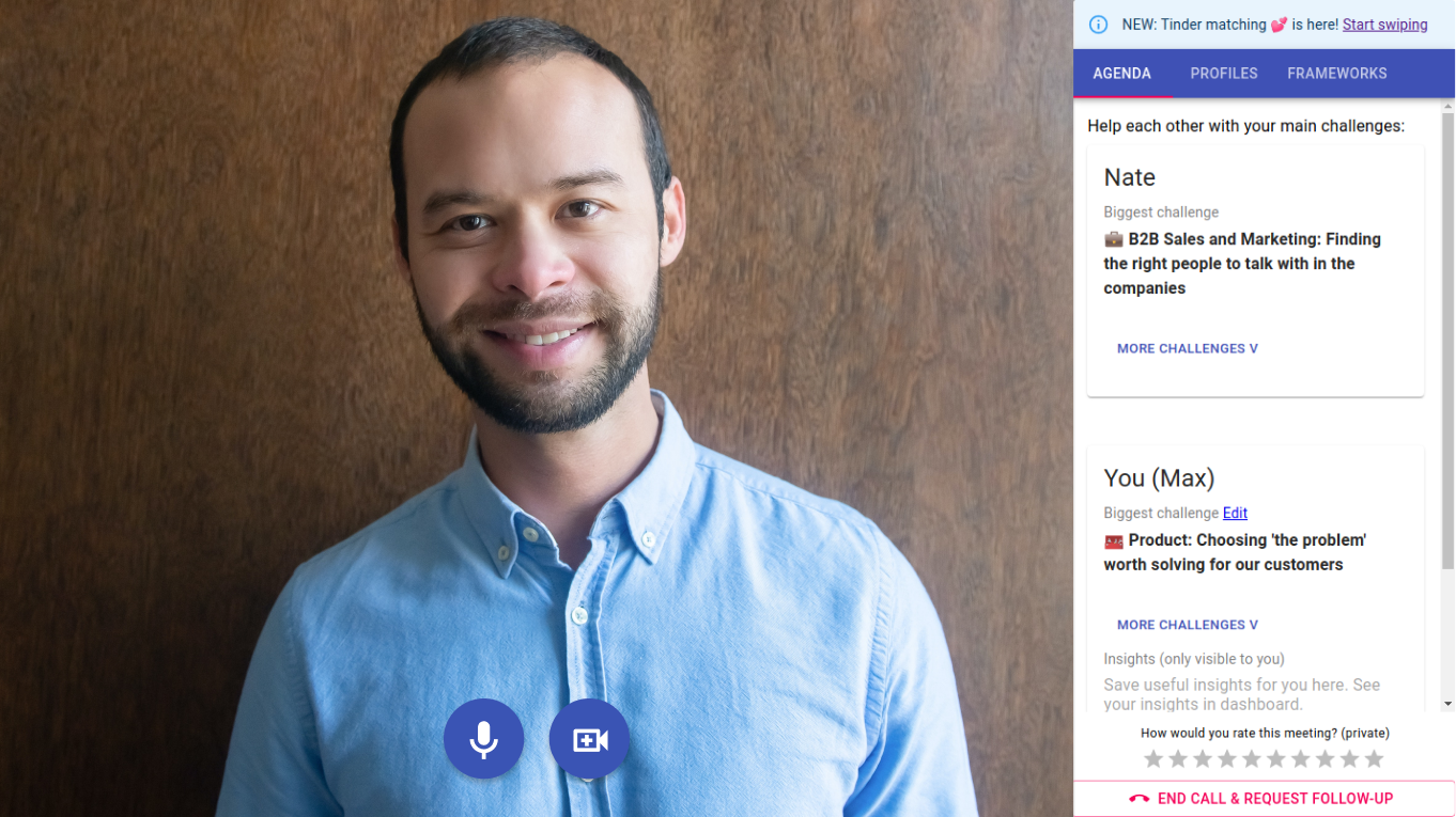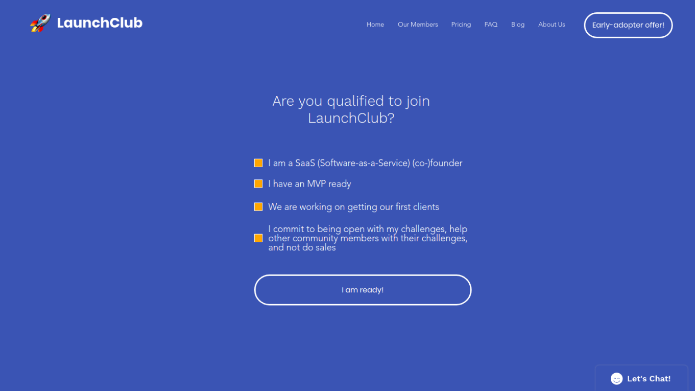 So, you have your MVP ready but getting first customers is a hard task. Likely, you will end up iterating both your product and your target audience. Fellow cherry-picked founders you meet in 1-on-1 video calls at LaunchClub will give you feedback and support you need to find that product-market fit. We vet all our founders with the interviews, and accept only those satisfying all three criteria: 1. SaaS founder 2. MVP launched 3. Coachable and Helpful Meet founders on a weekly or bi-weekly basis in 1-hour video calls. Scheduling is integrated with your calendar, so you set it once and forget it. By default, you meet a new founder every time. Calls are hosted on our own-call platform and have useful features such as challenges, profiles, follow-up meetings, and (coming soon!) tinder-style matching. Qualified? Join LaunchClub fam today! https://www.launch-club.com/