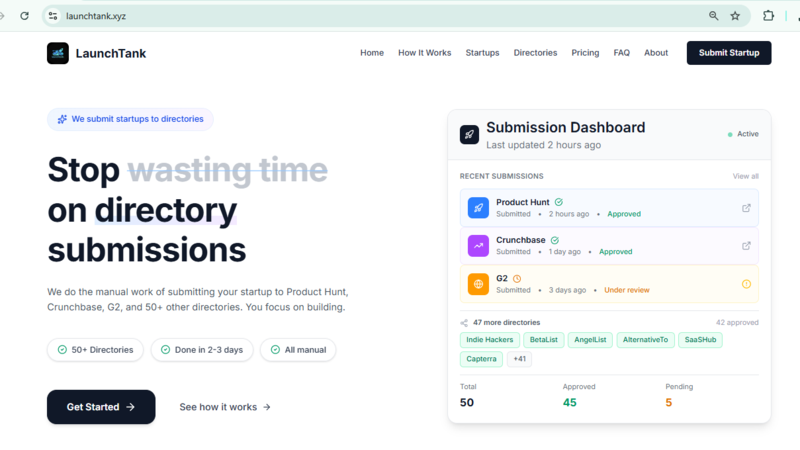 LaunchTank is a done-for-you startup directory submission service that helps founders list their product on 50+ carefully selected platforms like Product Hunt, Crunchbase, G2, Capterra, AngelList, AlternativeTo, and more with a single submission. Built for early-stage startups, SaaS products, and indie makers, it saves you from wasting days hunting for directories, filling repetitive forms, and tracking everything in messy spreadsheets. You share your startup details once, and LaunchTank manually handles the rest, getting you fast visibility, quality backlinks, and credible listings across the web. Instead of figuring out every site’s quirks yourself, LaunchTank’s team reviews your information and prepares optimized versions of your pitch to match different character limits, formats, and content guidelines used by various directories. They then manually submit your startup to 50+ top startup and SaaS directories within about 2–3 days, combining big names with niche platforms that actually drive traffic and SEO value. All submissions are human-made, not automated spam, which keeps your listings accurate, consistent, and far less likely to be rejected. LaunchTank tackles one of the most annoying but important growth tasks for founders: getting listed everywhere that matters. Researching good directories, rewriting your description for every site, re‑uploading logos and screenshots, and tracking approvals can easily eat up a full week of focused work. Many teams either give up early or only submit to a few obvious platforms, leaving a lot of credibility, backlinks, and exposure on the table. With LaunchTank, that entire process becomes a single, simple action you can trigger at launch or during your next marketing sprint. The benefits go beyond just “being listed.” Appearing on respected platforms like Product Hunt, Crunchbase, G2, and Capterra helps you earn high-quality backlinks and makes your brand look more legitimate when investors, partners, or customers search for you. Many directories also send targeted referral traffic from founders, marketers, and early adopters who browse these sites to discover new products. A strong directory footprint supports your SEO, trust, and word-of-mouth with almost no ongoing effort once it is set up. LaunchTank also prioritizes transparency and control. After submissions are done, you receive a clear overview of where your startup was submitted, which listings are live, and which are still pending or under review, giving you a permanent record of your directory presence without maintaining your own manual tracking system. Pricing is founder-friendly: LaunchTank promotes an initial launch phase with limited free spots, followed by affordable paid tiers starting from a low flat fee for full directory coverage, making it a smart “infrastructure” purchase you set up once and benefit from for months and years.