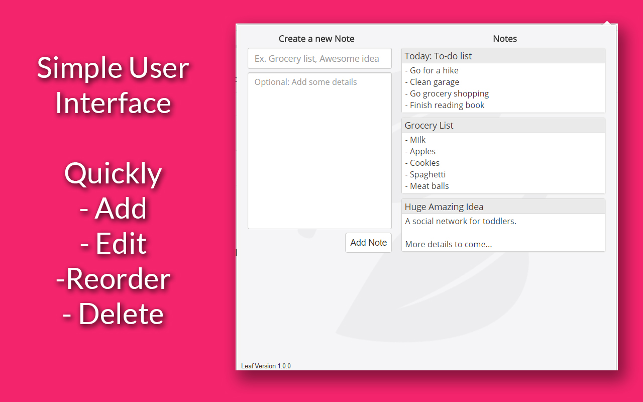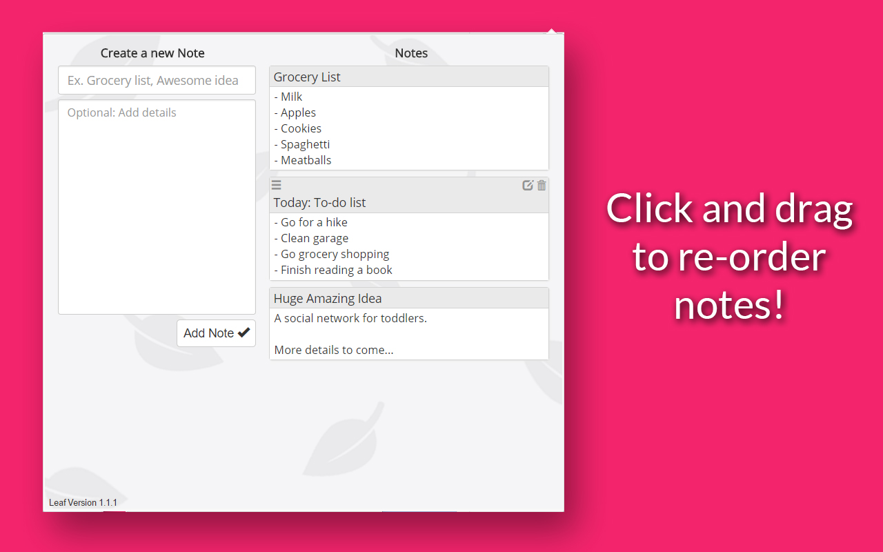 Hey, my name is Josh and I'm a computer engineering student in Toronto Canada. I always have random ideas and things I want to write down. I have tried using the default notepads for both windows and my phone. However both of these were extremely slow and messy so I ended up wasting a lot of time trying to organize and formatting these notes. So I decided to make a simple, quick and pretty way to store notes on chrome since I was always on the computer (for both work and leisure)! Just wanted to share it with anyone also facing the same problem :) Version 1.1.3 Update: - Text now saves in text boxes if not submitted - Updated icons - Moved edit button away from trash button Version 1.1.2 Update: - Click and drag option to re-order notes - Quick add by pressing enter in first input box - Updated graphics and icons
