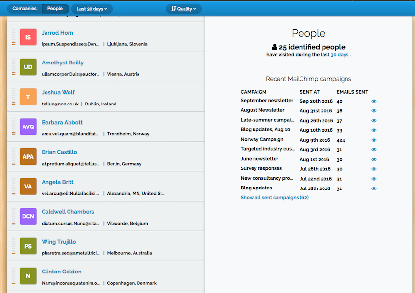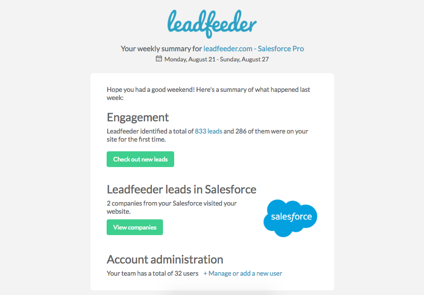 World's best website visitor tracking for sales and marketing Leadfeeder uses your Google Analytics data to show real companies visiting your website. It integrates to your CRM and email marketing tools to increase your sales intelligence. -Quick setup Sign up for free, connect Google Analytics and see immediately which companies have visited your website in the last 30 days. -Generate leads You get new online sales leads throughout the day which means you can contact your leads with perfect timing. -Automatic reporting Leadfeeder will send your sales leads’ visit data to your CRM and email inbox so you’ve got the data where you need it. -Relevant data Set up your own powerful lead filtering and use our in-built lead scoring to know which company to sell to next.