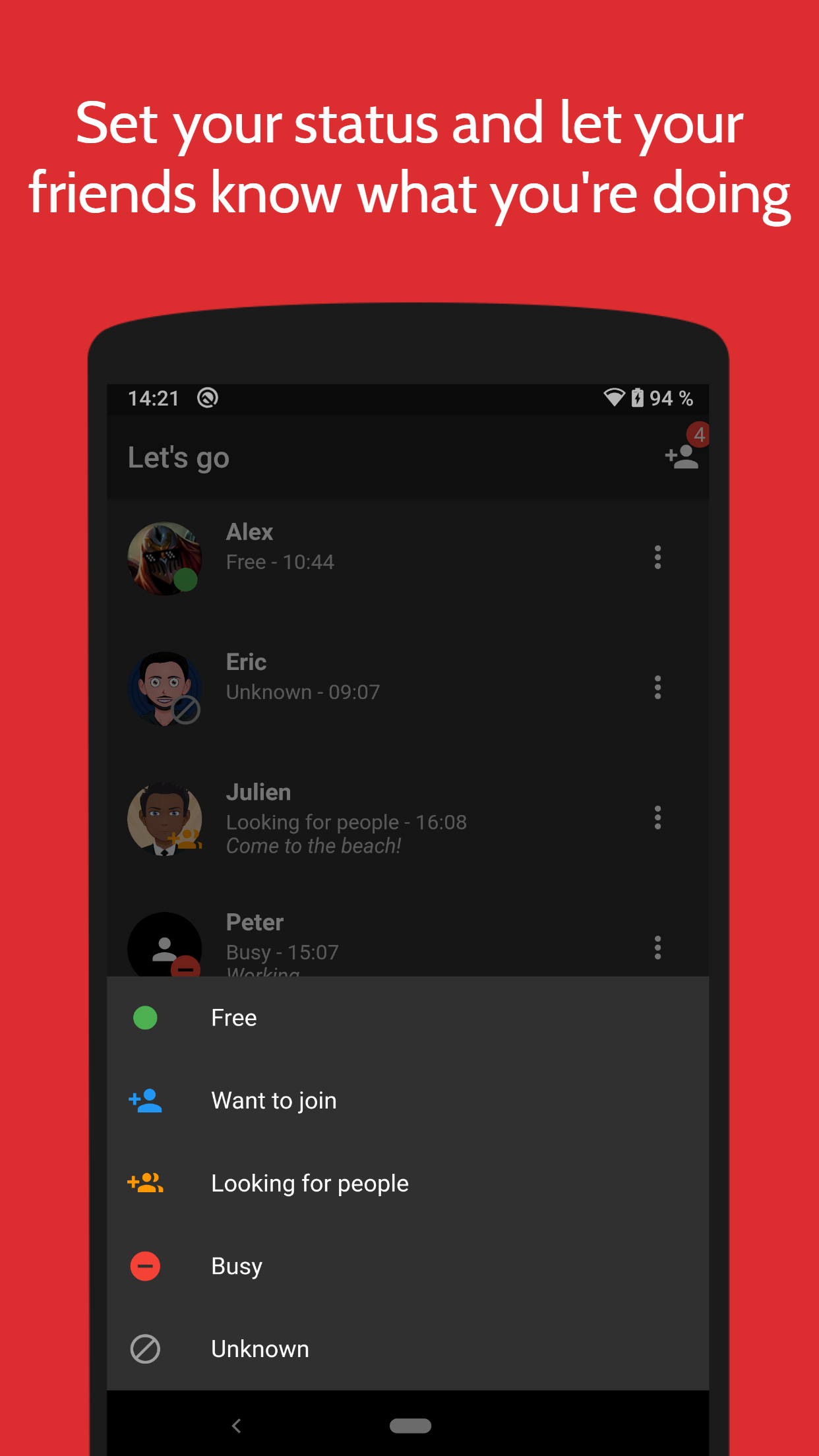 Hey, I'm Loris and I want to introduce you to my app I created over the past weeks. Let's go is now available for free on Android (iOS coming). Let's go is the simplest way to do something with your friends. Set your status to free or looking for people and your friends will receive a push notification if their status is also free or looking for people. No more texting or calling needed! You can set your status by tapping on the bottom bar. You can also add a custom message to your status. There are lots of upcoming features like a built-in chat, add current location, more precise status duration and many more. It would be great if you share Let's go with your family, friends or colleagues, and we can build a small community together. You can add me on Let's go, my username is loris156 I'm looking forward to your feedback and suggestions!