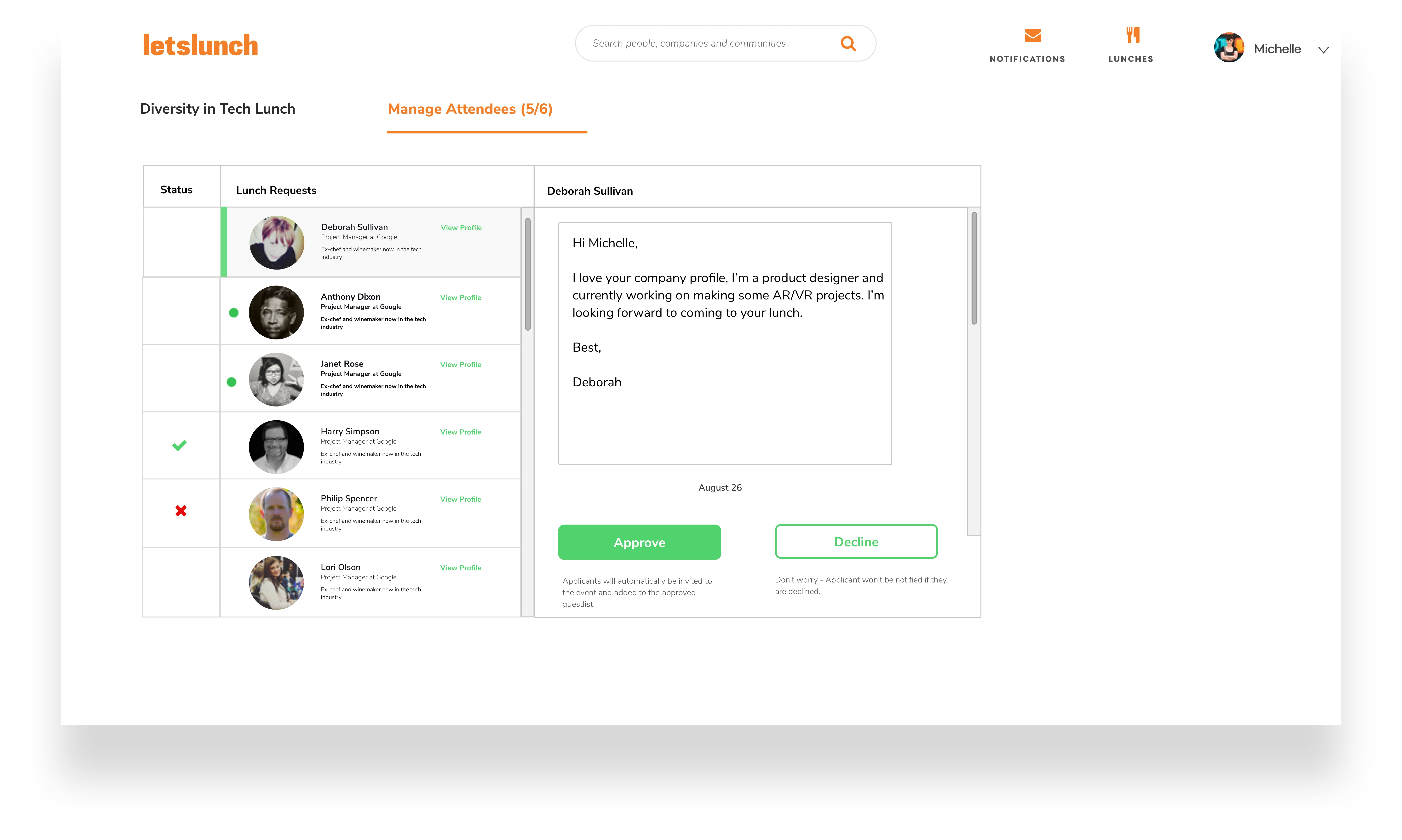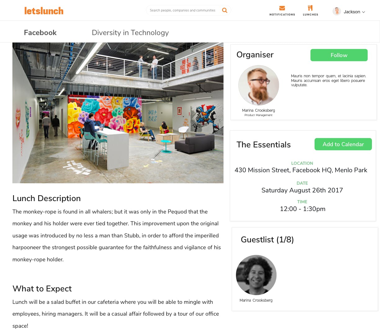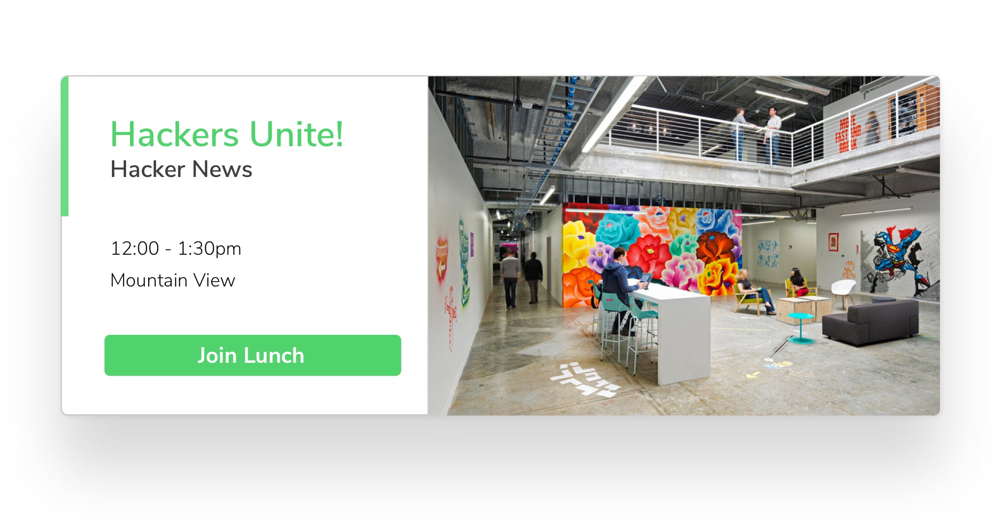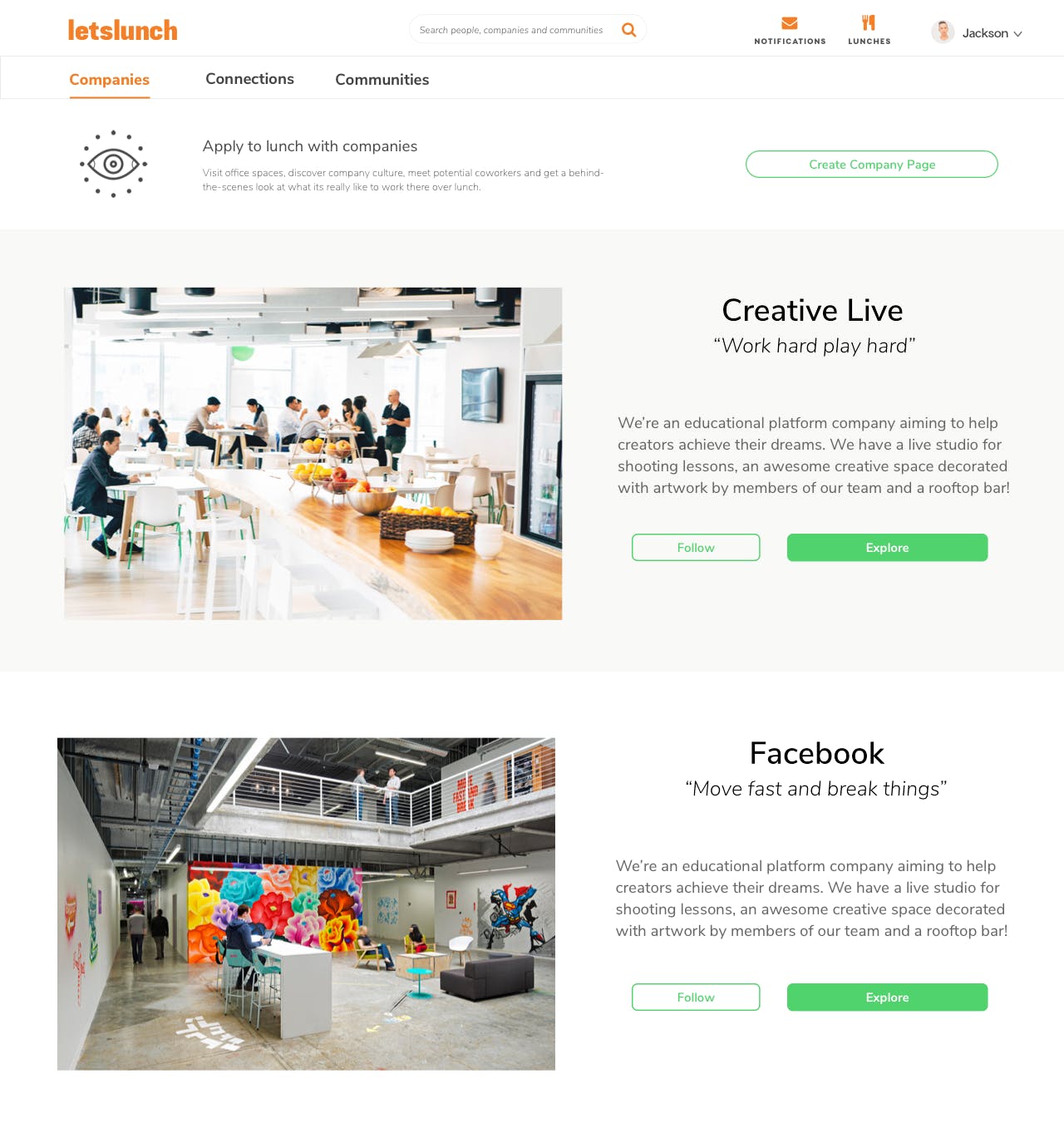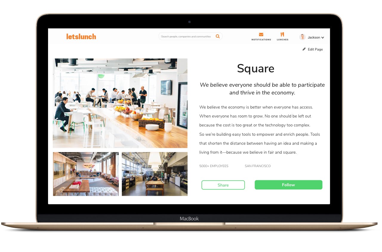 LetsLunch to help you connect with startups and and potential co-workers! Explore the company culture, meet future coworkers and discover what working at a company is really like. The new service that will help you meet innovative companies over lunch in their cafeteria. This empowers job seekers to get a behind-the-scenes look at a company, meet company employees over a casual lunch and see if it's a culture you want to be part of. It helps companies to assess candidates based on culture and value fit first. Upon mutual interest, both the company and candidate can then take it to the interview level.