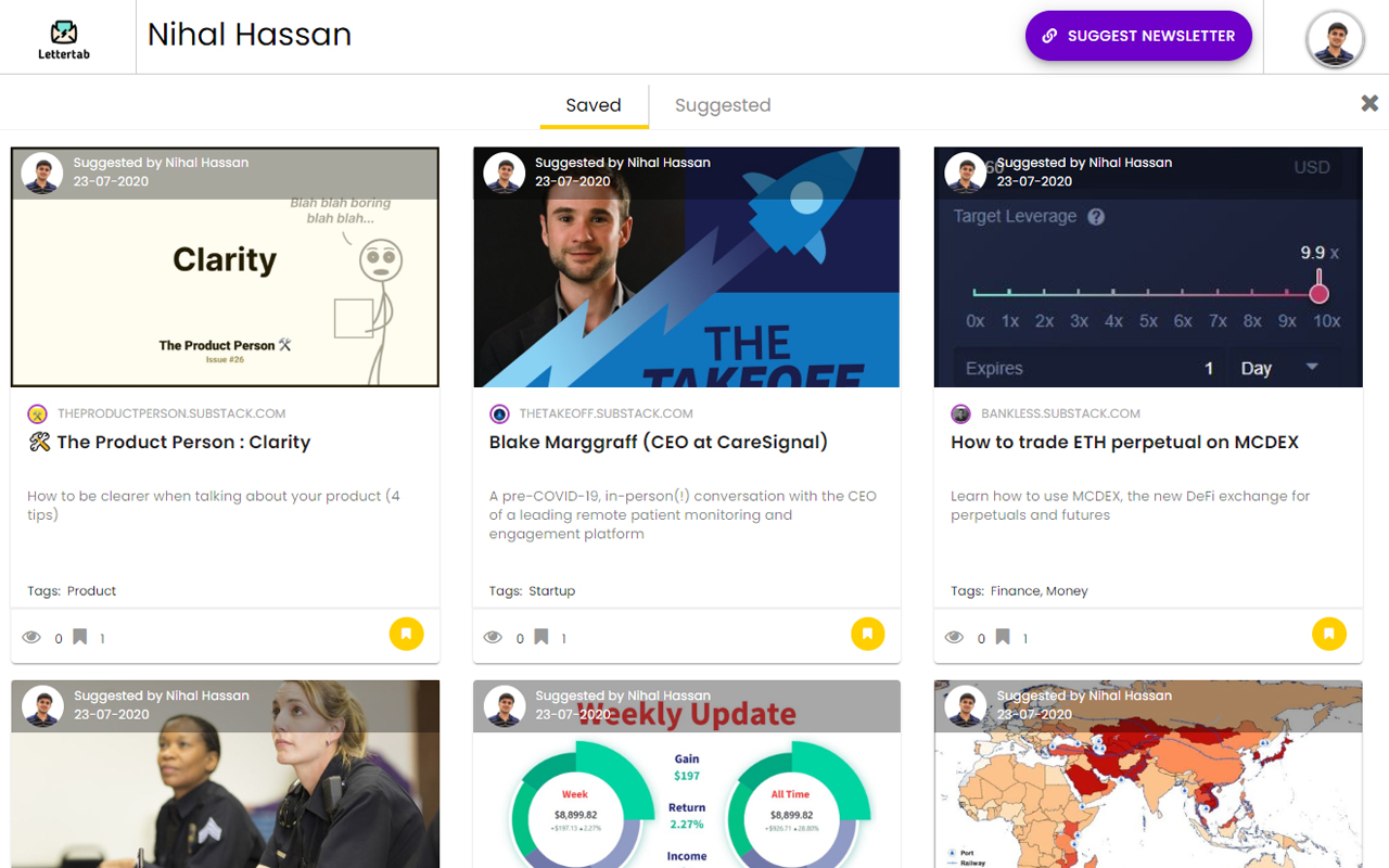 "It's time now. Someone better index good emails." Hi Beta Page ?, Lettertab is a Chrome Extension to find new newsletter posts and creators on topics you love - every time you open a new tab. Also work on browsers like Opera and Edge. It was designed to be different than other content discovery apps in a few ways. ? Focus We don't index everything, just editorial newsletters by independent writers. This results in a nice experience for readers who like subscribing to smart newsletter creators. ? Design We were inspired by apps like Muzli, Zest.is and Pinterest. If you've tried any of these before, you'll find the interest familiar. ? For Readers Every time you open a new tab, a new set of newsletter posts may load. If you find something interesting, bookmark it. You find a great post anywhere on the intraweb, share it(submit) with us too! ?? And Creators If you're a newsletter creator, we'd love to add your posts on Lettertab. You automatically push your new posts on Lettertab, just add [email protected] on your email list. We only link to your latest posts. Everything you see in Lettertab is created and contributed by people like you. Unlike social media, Lettertab democratizes community curation without a complex algorithm that can be gamed by the knowledgeable few. Any feedback is much appreciated! Cheers, Nihal