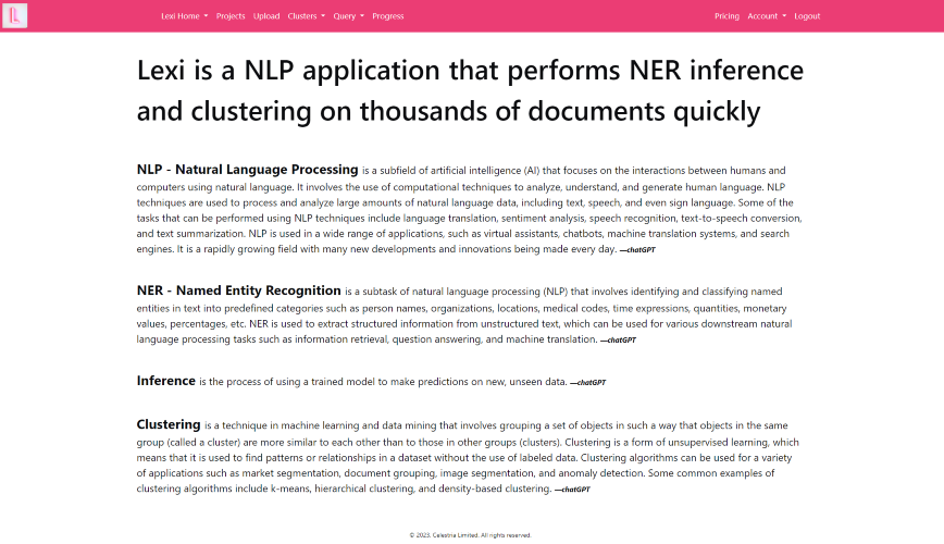 Lexi is a SaaS AI-powered application that: - Extracts information from unstructured text in thousands of documents at once. - Clusters documents. - Allows users to edit and add new annotations to documents, and then download the annotations. - Scrapes webpages. - It’s NOT based on OpenAI’s API.