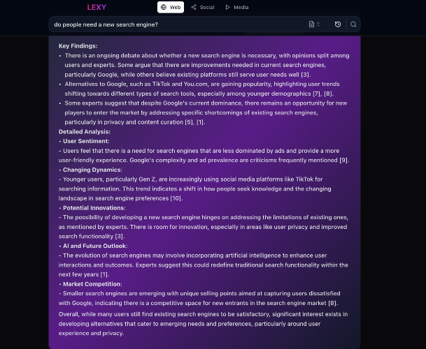 Lexy AI Search is an advanced, AI-powered search engine designed to revolutionize how users retrieve information online. It eliminates the need for endless navigation by delivering precise, actionable results, leveraging cutting-edge techniques like dorking for highly specific insights. With support for both text and vision-based search, Lexy caters to professionals, researchers, and everyday users who need fast, accurate answers. By integrating seamlessly into workflows, Lexy boosts productivity, saves time, and makes finding information effortless.