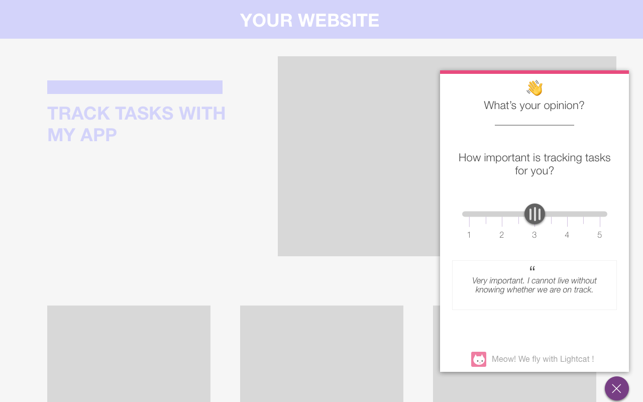LightCat is a simple, a no frills polling library. Pick a poll, embed on your website or product, and start measuring your experiments. Unlike other survey tools, LightCat is laser focussed on polls for tech products. Therefore, the analysis of results is super easy and powerful.