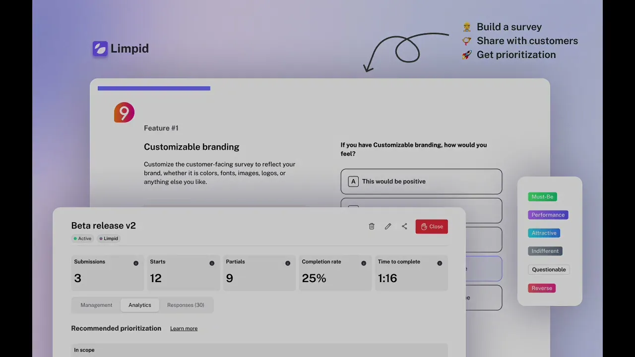 Limpid is the all-in-one tool for Kano Model research and analysis. Build a survey in minutes. Involve customers and prospects. Prioritize your product features. - Save months of development work. Don't build features that would leave your customers indifferent. Avoid the feature factory model - Go from satisfaction to delight. Find what your customers don't expect, and wow them. And don't overlook basics: they are foundational to build trust - Run continuous product discovery, the async way. Validate your feature ideas and inform your decisions with customer input. Ship only what matters