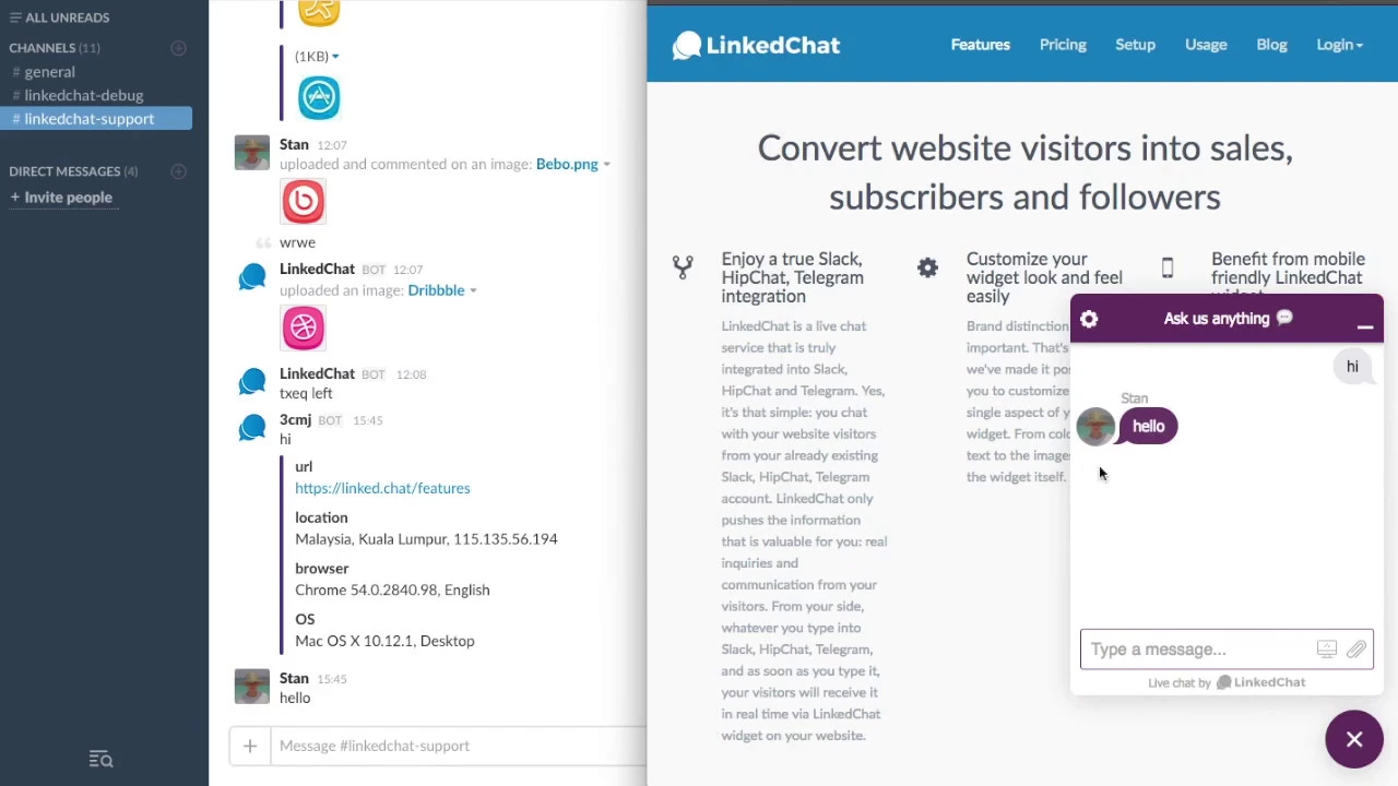 Live chat with website visitors directly from Slack, HipChat, Telegram. You don't need yet another chat client. Talk with your customers using your existing Slack, HipChat, Telegram service. Visitors of your site can instantly chat with you about pre-sales questions, support issues, etc. while you and your team respond directly from Slack, HipChat, Telegram without any additional tools to install or use. Just link your Slack, HipChat, Telegram channel, copy/paste small code into your website and you will be able to reply to your visitors directly from Slack, HipChat, Telegram.