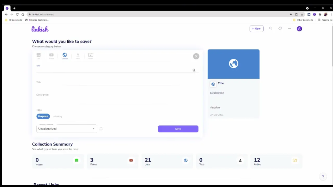 I am ecstatic to show our first in line product called linkish. It is the dream platform for people who are sick of their boring bookmarks and don't want to open 50 browser tabs just to find what is in them. Now embed content from your links in your dashboard. Who is it for? : - Bookmark manager for individuals : Import bookmarks from different sources and organize Content curation tool for researchers : Save research links with unlimited highlights Visual board for creatives : Images / videos / audios embedded in one place Link manager for companies : Manage links collaboratively and securely with your team What does it do? : - Save from anywhere : Save from extension/dashboard, import from browsers/other apps Tagging : Add tags for faster access, we will tag them with see, watch, listen, read categories Nested collections : Import browser bookmarks with the nested folders kept intact Link manager for companies : Manage links collaboratively and securely with your team Share with friends : Share link collections privately with your friends or colleagues or publicly Web Highlighter : Highlight text on a web page and it will be highlighted on next visit also Save links as PDF : Your favorite site down after you bookmarked it? Save them as PDFs Broken link finder : Find old and dead broken links and delete them with one-click Duplicate link finder : Find and delete duplicate links from multiple folders with one-click Coming soon : 10 GB storage per month, ability to encrypt your content, integrations https://linkish.io