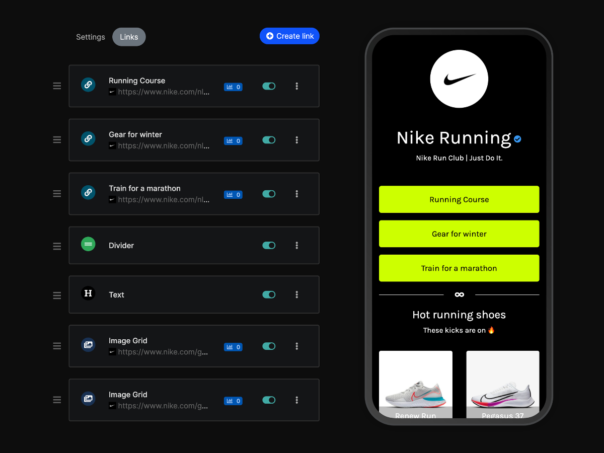 linkriff is a micro page builder that allows you create your own social landing page via a WYSIWYG editor. It integrates with most of the popular streaming services, social networks, your own RSS feeds and native email service provider integration to grow your subscriber list. From an admin perspective it gives you insights on visits, CTR rate, referrers and user info such as country, device and operating system.