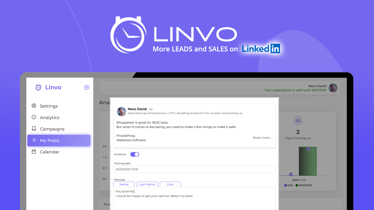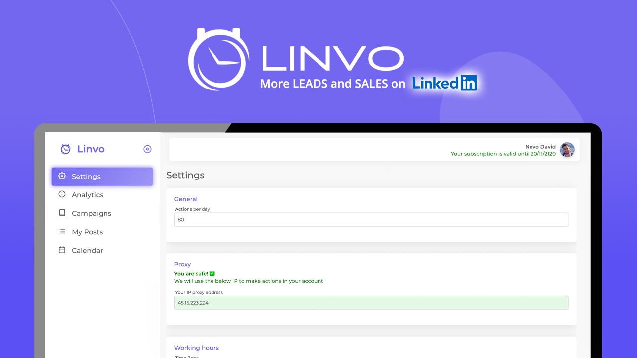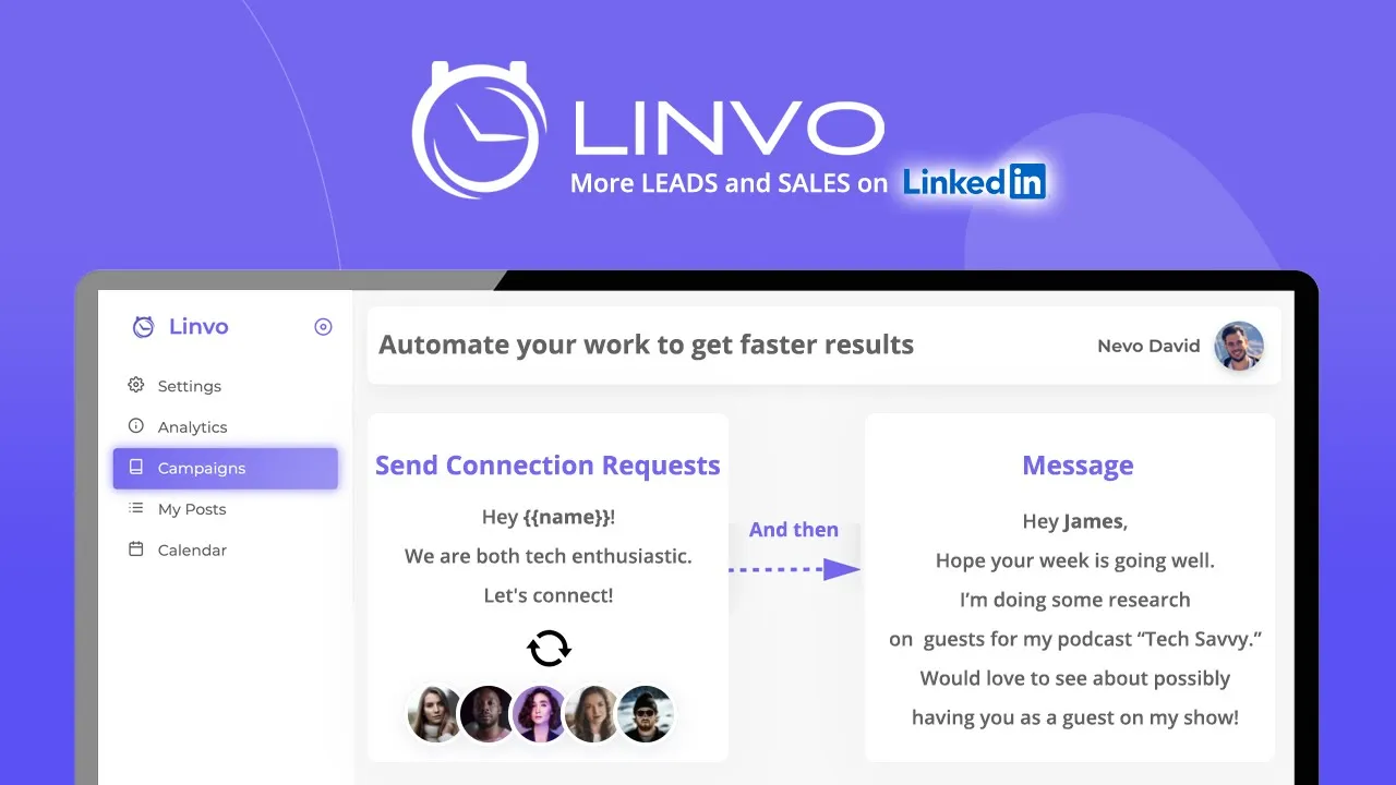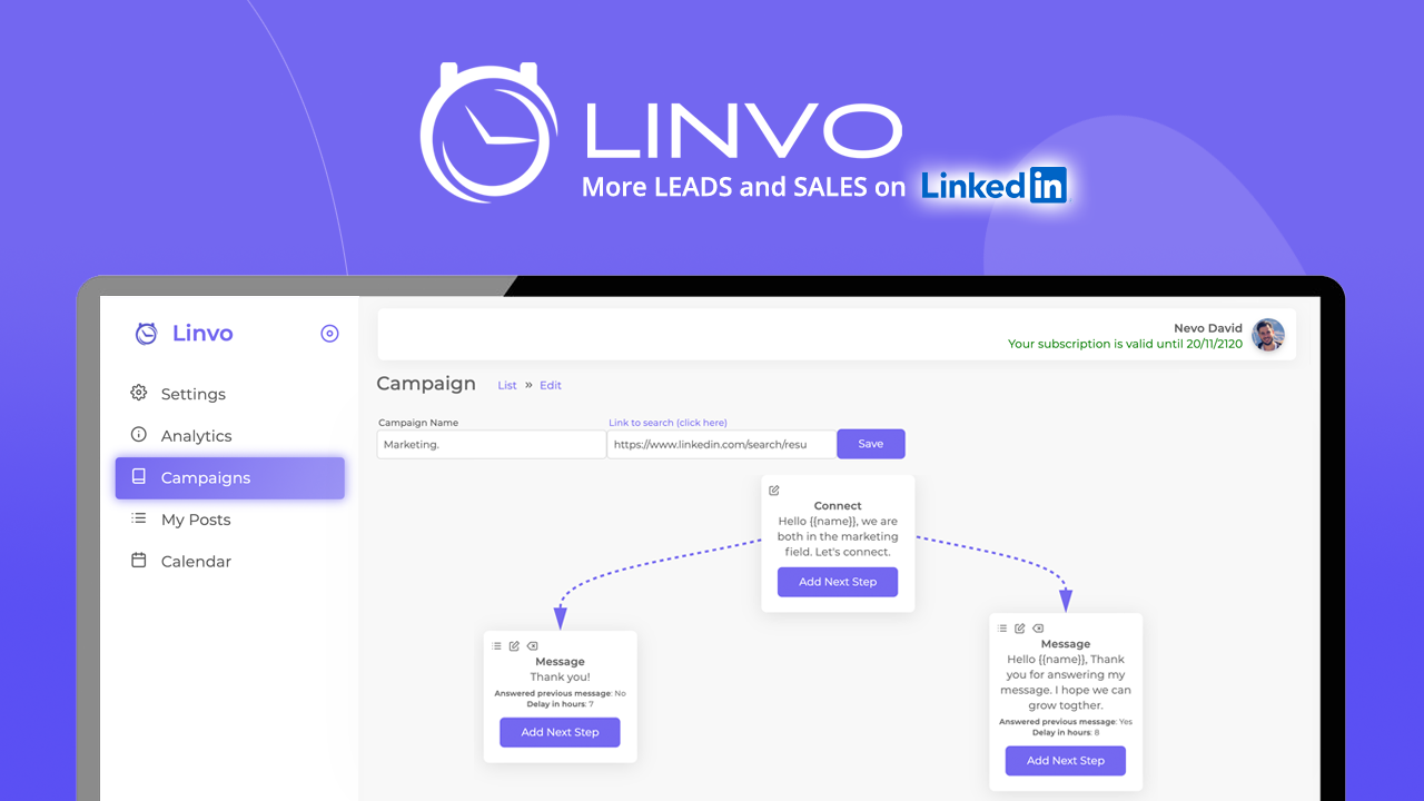 Linvo is a Linkedin Automation Tool. It allows you to grow your network faster to achieve your goals more quickly. As people, we are limited to the number of actions we can do on Linkedin every day. Linvo can change that. Please click here to read our full explanation. Linvo Automates your Connections, Messages, and Posts. So instead of getting five connections every day and five messages. You get 80 connections every day and 80 messages.