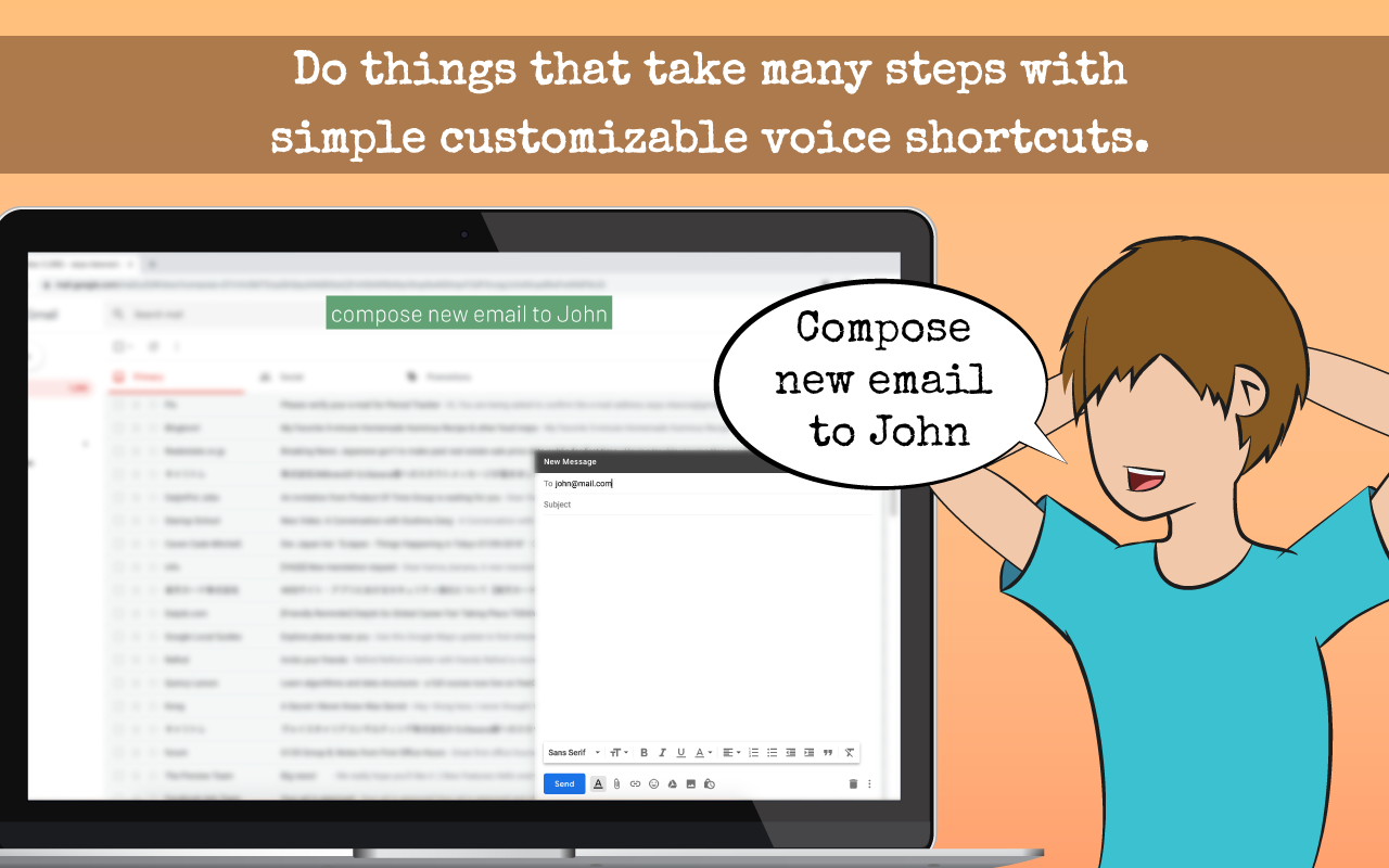 * 75+ default commands that can be expanded to infinity with additional plugins and tons of options * Multi-language support * Click anything on the page by saying "tag" then saying the annotation in the yellow box next to it. * 7 default plugins: * Reddit * Google * Hacker News * Anti-procrastination * Top Sites * WaniKani (Japanese Kanji Learning Tool) * Browser * Play, pause, mute videos... * Next tab, previous tab, select tab, new tab... * Scroll up, down, bottom, top...